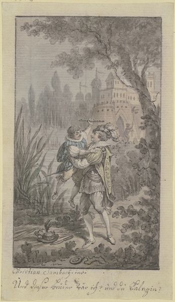Editor: Here we have Louis Philibert Debucourt's "Le Coup de Vent," created between 1775 and 1832. It’s a print, etching, and drawing all in one, and quite humorous. What symbols or social cues are jumping out to you? Curator: The entire scene screams "social disruption." Notice how the wind, the literal "coup de vent," becomes a metaphor. Consider the umbrella: not just protection from the elements, but also a symbol of status. Now struggling against the wind, it signifies the challenges to social stability of the time. Editor: Interesting. The figures themselves seem to be battling the wind, literally and perhaps figuratively, if the umbrella is about status. Curator: Exactly! Look at the woman's clinging dress, the flying hat...clothing articles become markers of identity tossed about. Think of the French Revolution brewing at the time, a period where traditional hierarchies were challenged. This "wind" isn't just meteorological. What emotional reverberations do you see? Editor: I suppose the expressions could be interpreted that way, too: the woman's anxious gaze seems to mirror broader anxieties during a turbulent historical time. The man looks cross, even defiant. Curator: And he's desperately trying to retain control, isn't he? The way he grips the umbrella, facing directly into the storm, shows resistance against an unmanageable shift. What does that defiant expression bring to your mind? Editor: Well, the fact that it’s a caricature says it all…maybe an echo of resistance to change? I’m definitely seeing the print in a new, socio-political light now. Curator: Indeed. "Le Coup de Vent" captures more than just a gust of wind; it’s an insightful and humorous visual commentary on a society grappling with change. Editor: Definitely, thanks for helping me understand how clothing can signify larger social anxieties that were up in the air!