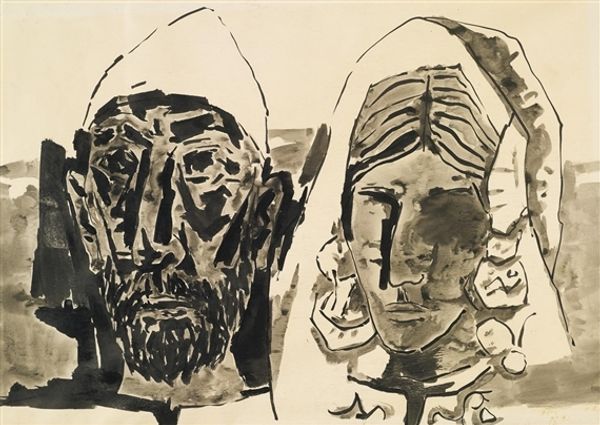 Richard Diebenkorn created this untitled study of two heads using ink and graphite wash on paper. The composition immediately strikes us with its contrasts: the raw, unfinished lines of the left head versus the more shaded and solid form of the right. This tension in form speaks to the essence of Diebenkorn's approach. The rapid, almost frantic lines suggest an attempt to capture the fleeting essence of form, juxtaposed with the solid mass of the second head. It's as if Diebenkorn is exploring different modes of representation within a single frame. Consider the semiotic implications: the contrast might imply a dialogue between different states of being, presence and absence, or even the struggle between concept and perception. Diebenkorn's sketch becomes a site where fixed meanings are challenged, inviting us to question the nature of representation itself. Note how these formal qualities function not just aesthetically but as an inquiry into how we perceive and understand reality.