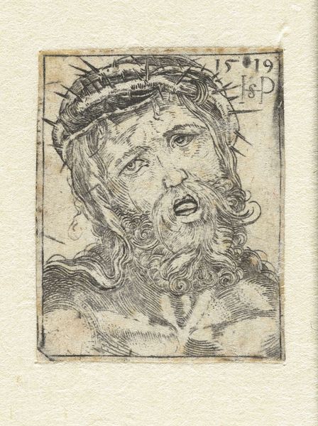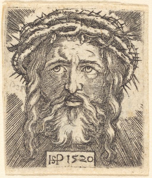 Sebald Beham’s "Head of Christ with Crown of Thorns" presents a study in contrasts, etched into a small, intimate plate. The close cropping intensifies the emotional impact, drawing us into Christ's suffering. Notice how Beham uses dense, radiating lines behind the head to create a halo effect, yet the starkness of the etching avoids any idealization. The crown of thorns is rendered with meticulous detail, each thorn a sharp, distinct element that contrasts with the soft waves of Christ's hair and beard. This juxtaposition highlights a central tension: the divine versus the brutally human. The expressiveness in Christ's eyes, achieved through minimal yet precise lines, speaks volumes. It reflects the philosophical debates of the Reformation era, where artists like Beham grappled with representing religious subjects in a new, more personal light. This print functions as a powerful emblem of faith, rendered through the stark language of line and form. Its value lies in this constant re-evaluation and restatement.