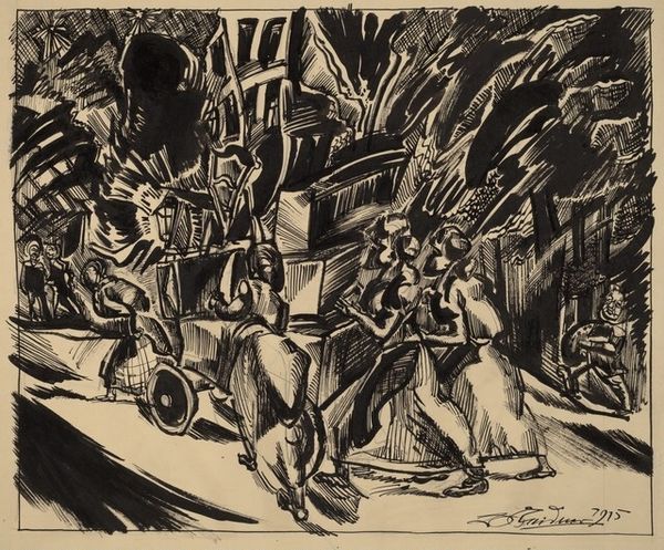 Curator: This is "At the Hairdresser's," a print by Emil Betzler, likely dating from around 1920. It's an ink drawing that reflects the visual language of Expressionism. Editor: My first impression is of organized chaos. It's crowded with figures and details, but rendered in such stark monochrome, it evokes a distinct moodiness. There is something gritty and urgent about it. Curator: The mood definitely comes from the Expressionist style. Notice how the sharp lines and distorted features convey a sense of unease, a certain psychological intensity that was characteristic of art created in response to the first World War and Interwar periods. It’s not simply a scene; it’s a state of mind. Editor: It is interesting how the materials are so fundamental to creating that feeling. Look at the labor invested here to build this print: the process of the artist and the technician, not only depicting but building, an industrialized metropolis of fragmented visual matter. Curator: Indeed, the city itself becomes a character, mirrored in the storefront's window display behind the motorcycle taxi, or "Taxenir," as labeled on its sidecar. The mannequins in the shop mirror the city dwellers—fashionable but perhaps also artificial, reflecting changing roles in society after the war. Editor: Those mannequins are striking. I like how Betzler plays with textures too—the smoothness of the mannequins contrasting against the rough textures of fur and fabrics. There is clearly some playfulness to subvert traditional artistic hierarchies of materials here as well, focusing less on pure artistic ability and more on common consumer culture as subject matter. Curator: And even a bit of humor in that tiny dog near the couple on the left, like a subtle wink amidst all the seriousness. It serves as a commentary on societal pretensions and values. The "cityscape genre painting" becomes a stage for observing ourselves. Editor: This detailed study reveals how art, especially in times of change, incorporates cultural narratives into production processes. What appeared chaotic on the surface reveals organized intentions through material choices and social commentary. Curator: It really brings together so many layers of understanding, revealing complex urban lives a century ago that continue to influence how we see ourselves in the city today. Editor: Indeed, observing its creation unveils so much about an industrialized vision of its time that still reverberates in artistic spaces now.