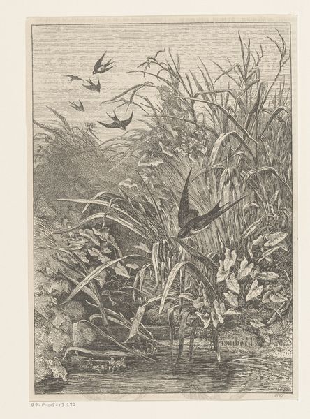 Curator: Karl Bodmer created this fetching sketch, titled "Zwaluwen"—or "Swallows"—in 1873. The piece currently resides here at the Rijksmuseum. What are your first thoughts? Editor: My immediate thought goes to its monochromatic nature— it's a landscape mostly, but where's the vibrant Dutch color we often see in artwork of this period? It also feels a bit unfinished, like a quick study. Curator: Perhaps Bodmer sought to capture a fleeting moment. The immediacy gives it a certain intimacy. The soft strokes of pencil bring those swallows and marsh reeds alive, don’t you think? Editor: Yes, that I can grant. But the very notion of the “sketch” raises all sorts of questions about value and production! What was its intended purpose, exactly? Was it a preparatory piece? Did the artist ever anticipate it would wind up here? Curator: Ah, always back to nuts and bolts. I see them taking flight towards the sun, leaving behind a world tethered to materiality, a poignant dance of liberation in a world often weighted down by such concerns. The precision, yet lack of precision allows one to experience something greater, almost ephemeral in form. Editor: Liberation indeed— the liberation from the confines of craft perhaps. Consider the materials themselves; pencil and paper, ubiquitous, easily sourced. Not exactly precious metals mined from afar! Was this simplicity a deliberate commentary on lavish, aristocratic patronage? Was Bodmer challenging conventional methods? Curator: Maybe it's the other way around? Perhaps the fleeting nature of beauty *is* valuable, which is to say the immediacy is precious and can make anyone stop, observe and reflect about nature? Its humbleness serves to center beauty in an ordinary world, not somewhere to be mined? Editor: Hmmm. Regardless of intentionality, it reminds me that this seemingly delicate "sketch" is actually made of robust stuff! It speaks volumes about labor, and its relationship to high art and simple craftsmanship. Curator: Well, thank you for bringing to light the underlying values that construct the simplicity within. It makes me see so much more within this seemingly quiet piece. Editor: Absolutely! Thanks to Bodmer for creating it.