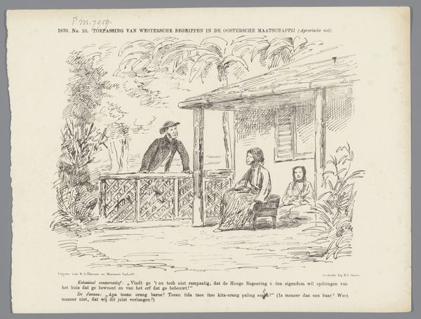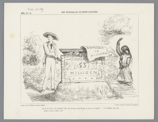 Curator: Welcome. Today, we're looking at a piece called "Spotprent over de grondwetsherziening, 1887", a drawing from 1887 by Johan Michaël Schmidt Crans, rendered in ink on paper. Editor: It's giving me slightly melancholic vibes. The style reminds me of old illustrations from fairy tales, but the overall tone feels... political, almost? Curator: Precisely. It is, after all, a political cartoon. Note the central figures—a child labelled "Revised Constitution" taking its first step, guided by a woman representative of something larger, perhaps the established order. Look closely at the lines; they're simple yet evocative, carefully delineating the weight of the woman’s gown against the vulnerability of the child. Editor: Yes, the "Revised Constitution" as a child is a strong visual metaphor—new, needing guidance, and slightly unsteady on its feet. And is that supposed to be the voting population tempting it to come closer, with outstretched hands? I love how they are offering what look like chicken feed. Subtly undermining. Curator: Consider the visual architecture. The fence creates a clear division, a boundary being crossed. And yes, that woman, labeled in the corner, tempts the "child". Editor: And in the background, a slightly idealized countryside. A little bird observing everything…There’s almost too much happening; my eyes are bouncing all over! Curator: That’s characteristic of political cartoons of the era. It's densely packed with symbolism. Note the relationship between text and image. The caption acts almost as a second layer of interpretation, reinforcing the satirical intent. Editor: It's interesting how the artist used such an intimate scene – a mother encouraging her child to walk – to represent a complex political issue. Almost domesticating it. It makes the concept more relatable. I wonder if that was Schmidt Crans' intention? To bring it home, to the common folk? Curator: One can certainly argue that. By translating complex political discourse into easily digestible visuals and familiar scenes, the artist ensures wider accessibility, while also layering in their critical commentary. Editor: Right, art as not just observation but participation. These political statements give an intriguing peak into what social narratives drove Johan Michaël Schmidt Crans’ process at this point in time. Curator: Indeed, it is a powerful glimpse into both a personal ideology and historical context of the period.