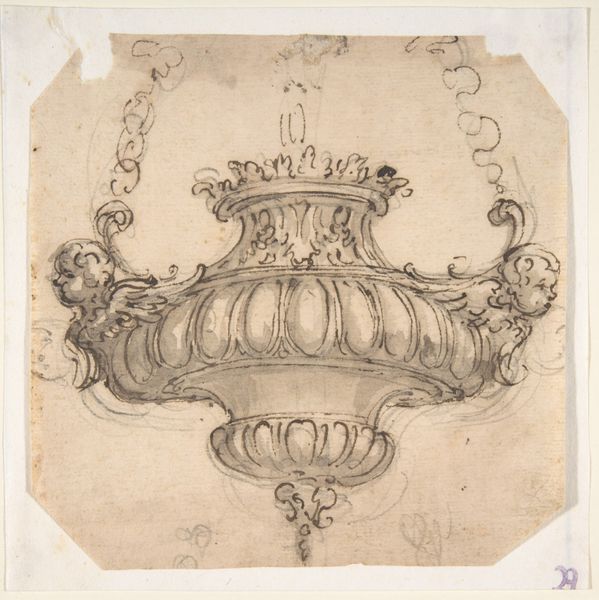 Curator: What we have here is a design—'Ontwerp voor een geëmailleerde coupe met een met ramskoppen versierde nodus' to give its full, glorious title. Created between 1850 and 1870 by Frédéric-Jules Rudolphi, this work offers us a glimpse into the world of decorative arts through pencil and pen. What's your first reaction? Editor: Stately. The first thing that struck me about it is the ornate design, all black swirling detail. It feels almost… theatrical. The vessel itself reminds me of an extravagant stage prop waiting for a dramatic scene to unfold. Curator: The piece certainly speaks to a very specific kind of opulence. If we really dig in, we notice those ram's heads—the "ramskoppen"—giving it an interesting energy. There's a blend of delicacy and strength here, you see? It's as though the design wants to appear refined but also hints at some hidden power. Editor: I do now! Semiotically, those repeated faces almost appear as guardians, yes? This feels different from typical decorative art. I almost expect this design not for use, but display. I keep asking myself "who commissioned this?". The base and its position within the frame give the piece gravity. It has significance. Curator: Oh, precisely! It transcends mere decoration. Look closer—the swirling patterns are incredibly intricate, demanding both skill and patience from Rudolphi. In my mind, the dark detailing against the subtle shading gives it depth. It looks almost three-dimensional! Almost as if we could pick the object right off the surface. Editor: And think about that, yes. He wants to present an object so tangible we desire to posses it. To grasp it. Yet the object can only ever remain here. Captured in two dimensions. Beautifully melancholic if I dare to say it. Curator: I think that's very astute. Its stillness lends a peculiar sort of gravitas. Perhaps we get caught up in its still majesty? Like frozen music? Editor: It is compelling to ponder upon what sort of hands would hold such an object, if this object ever became 'real'. Thank you! Curator: Thanks to you.