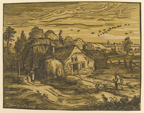 Curator: Immediately striking, isn't it? Editor: It has a strange, almost haunting, simplicity. A starkness achieved through its limited palette and direct, economical lines. Curator: Precisely. We're looking at "Landscape with a Farmhouse, from Four Small Landscapes," a woodcut created by Hendrick Goltzius between 1597 and 1600. Look closely at the medium. Editor: The density of the cross-hatching, the way light is suggested only through its absence…it creates an atmospheric perspective, doesn't it? That horizon line punctuated by what seems to be a distant village spire is masterfully subtle. Curator: Yes, but let's also consider the process. Each mark a deliberate cut into the woodblock, requiring intense labor and a specific skill set, highlighting a particular workshop environment for the production of reproducible images during that period. Editor: Absolutely, and I agree. However, the formal arrangements here are remarkable: The thatched roofs mimic the undulating landscape, mirroring nature itself. The foreground figure is juxtaposed against the architecture drawing the eye through the piece, revealing depth. Curator: And consider that foreground figure further. Is he merely a compositional element, or does he represent the laboring class? The piece encourages viewers to ponder on the material conditions of rural life. The presence of the figures, the home...these all represent a rural social fabric in a way that elevated forms of painting often ignored. Editor: Indeed, the texture throughout—rough hewn timber versus that cloud-swept sky—adds compelling tensions. Goltzius' grasp of contrasts, light, darkness… Curator: Well, seeing through both our perspectives, it's been fascinating examining Goltzius' work from both production and visual perspectives. Editor: Agreed. I was too drawn in with the form but you’re correct in bringing our focus to a fuller social, working context too.