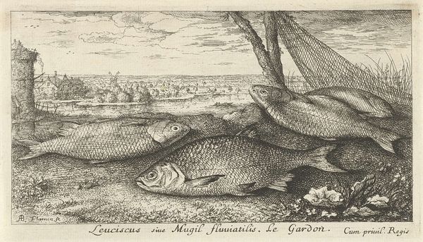 Albert Flamen created this etching of "Two Bream on a Riverbank" sometime in the 17th century. The composition is immediately striking, with the oversized fish dominating the foreground. Their textured scales and detailed fins are rendered with a precise, almost scientific quality. Notice how Flamen uses the stark contrast between the dark, dense lines of the fish and the delicate, airy strokes of the landscape to create a sense of depth and perspective. The horizon line is set quite high, which flattens the background and pushes the fish forward, emphasizing their scale and presence. This play with scale and perspective invites us to question our relationship to the natural world. Are we observers, or are we being observed? Flamen's precise technique and attention to detail elevate the humble bream to a subject worthy of artistic scrutiny, challenging our assumptions about what is considered beautiful or important. Ultimately, it is in these formal qualities that the etching transcends mere representation and becomes a meditation on perception itself.