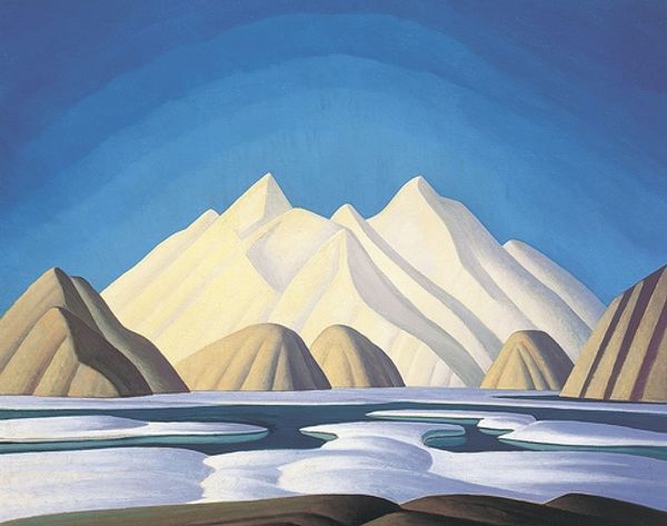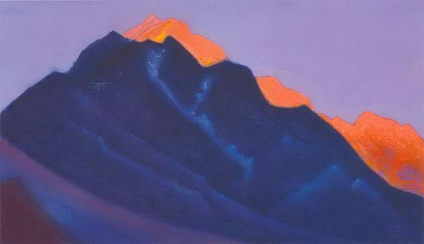 Editor: Here we have Nicholas Roerich’s "Sunset," painted in tempera in 1933. The mountain peaks are rendered in these striking oranges, reds and purples, contrasting sharply with the dark, almost bruised, foreground. How do you approach a work like this from a formalist perspective? Curator: Indeed, a work demanding scrutiny of its formal elements. First, consider the composition. Roerich has created a strong diagonal thrust, leading the eye from the lower right towards the vibrant peaks. Note how this is achieved not just through form, but also value contrast. We move from dark foreground to the brightest area in the painting – a calculated crescendo. How do you interpret that specific colour palette and application of paint? Editor: Well, the tempera application appears deliberately flat and matte, and the colours, while bold, are somewhat contained within defined contours. It’s representational, but abstracted to the point of emotional expression rather than strict realism. Curator: Precisely. The Russian Avant-Garde prioritized abstraction in the service of communicating an intense emotional reality. We could read the limited blending of colours as reinforcing that emotional immediacy. What about the brushstrokes? Editor: I see what appears to be layering of colours in parallel strokes; the brushwork reinforces the angularity of the peaks. It gives them a palpable sense of energy, rather than quiet contemplation that, say, Romantic landscapes might offer. Curator: An important observation. It brings the viewer into the immediacy of the depicted moment, of the creative process itself, rather than acting solely as a window onto another time or place. Editor: I learned a lot about breaking the components to find the underlying purpose! Curator: A rewarding journey, discovering structure, meaning, and feeling synthesized within the canvas.