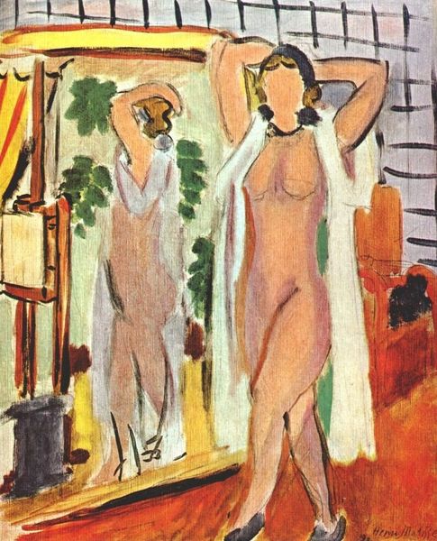 Curator: Ah, here we are. Henri Matisse’s "Standing Nude" from 1947. It’s an oil painting, characteristic of his Fauvist style. Editor: It just vibrates, doesn’t it? All that red! I immediately feel this… energy. Sort of unapologetic in its boldness. Curator: Absolutely. The Fauves, as a movement, challenged academic traditions of representation. Notice how the colors are used for their expressive quality, rather than accurately depicting reality. It was exhibited in that moment as an argument. Editor: It's interesting you say "argument," because even in its unfinished quality, I find it rather playful, almost celebratory. Like he threw the paint on and stepped back to watch it live and breathe. Especially that crazy carpet and patterned chair. The patterns vibrate right off the surface! Curator: Well, it certainly diverges from conventional nude paintings. Instead of idealized forms and sensual poses designed for the male gaze, this figure feels... well, almost matter-of-fact, like a casual observation, yet at the time it went against the dominant institutions in culture. It’s what many people in society may have seen but no gallery dared represent, or even imagine. Editor: It's cool you mention "male gaze" because she's not looking back, is she? It makes her very own, unburdened and untamed by expectation. There’s a strange neutrality, isn’t it? You sense Matisse is interested more in the pure form and colors. Curator: Precisely. Consider Matisse’s relationship with his models. There was a mutual exchange, not mere objectification. This painting captures a specific moment within the larger discourse surrounding the nude and representation within art. Editor: Thinking about that, I see her pose now less as "neutral" and more like she's grounded, in her power almost. As if she were not the observed, but the observer instead. It’s about power! Curator: Yes, power is an idea for the image's placement in that society. A new representation of not just female beauty but humanity itself. Thanks for your observation! Editor: Thanks, your insight opened up the world and discourse behind this, too!