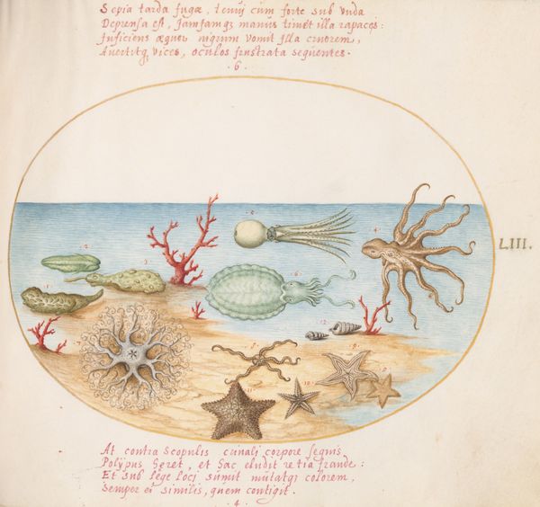 Curator: The Hoefnagel workshop gifted us this rendering of 'Plate 48: Ten Crabs,' created circa 1575 to 1580, using watercolor and colored pencil. I'm curious about your initial reaction. Editor: At first glance, it’s whimsical. The circular arrangement is striking, like looking into some fantastic, curated tidal pool. There's also something inherently unsettling about them, despite the bright colours. Curator: Interesting observation, unsettling in what way? Beyond a straightforward representational image, the composition evokes the era's fascination with natural history and the impulse to classify and contain the world. This impulse speaks to humanity's will to power and control over other beings and, therefore, to deep inequalities, whether we see those impulses being realised or challenged at the time it was made. Editor: Absolutely, yes, now I see it. It’s almost clinical, this display of distinct crab specimens suspended against a minimal aquatic backdrop, it evokes something more like taxonomic study. Notice how the artist uses the limited color palette to bring each crab's individual structure to the fore. Curator: Precisely. Each crab, numbered for identification, contributes to a broader picture of both scientific exploration and colonial desire. One might ponder on whose authority these creatures were depicted and for whose consumption, in a time fraught with political instability and imperial expansion, an emblem for broader debates around exploitation and dominion. Editor: Indeed, you've given me a different lens now to perceive the nuances of color and placement in the art, in which formal elements like line and color act as cultural artifacts, shaping understanding. I think about the soft rendering of shell textures. This brings a life to the depiction that undercuts its possible sinister connotations. It offers also moments of careful engagement with something other-than-human, which has to be remembered in conversations about historical exploitation and its current realities. Curator: So, viewing this, one could simultaneously appreciate artistic merit and consider broader societal and power structures... Food for thought! Editor: Truly. It gives you something tangible to focus on within all that historical analysis.