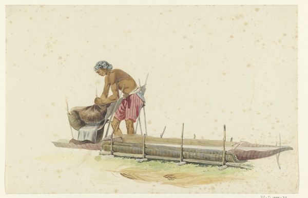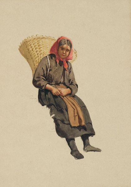 Curator: This is "Indian Coolie, Carrying a Basket," made in the 18th century by an artist from the British School. It’s a watercolor on paper, quite small at only 134 x 81 mm. Editor: The figure seems stoic, burdened, almost ghost-like against the backdrop of what appears to be a British encampment. It's a potent image of labour. Curator: Indeed. The emphasis is on the coolie's labor, the basket itself an object of intricate craftsmanship, and the materials he's carrying. It speaks volumes about colonial economies and the value placed on manual work. Editor: Absolutely, and the socio-political context is inescapable. The artist, situated within the British School, depicts this figure against the backdrop of imperial expansion, shaping the narrative and our understanding of the coolie's role. Curator: The small size also makes it feel like an artifact, a commodity from that era. Editor: A poignant depiction, offering insight into the period's complex intersection of art, labor, and colonial power. Curator: Precisely, something to reflect upon.