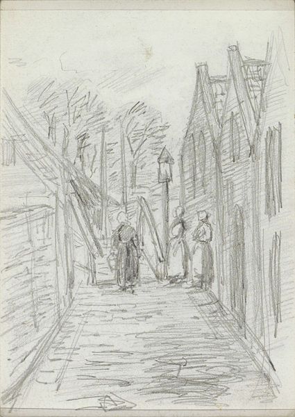 Editor: This drawing, titled “Straatje in een vissersdorp” – or "Street in a Fishing Village" – is by Albert Baertsoen, probably made sometime between 1876 and 1922. It’s a pencil drawing, and it reminds me of old photographs, capturing a slice of life. What stands out to you in this piece? Curator: What a deceptively simple scene, isn't it? The street, the houses, the figure in the doorway - each a carrier of meaning. To me, this isn't just a depiction of a village street; it's a visual echo of generations past, their lives intertwined with the sea. Consider the textures; the rough strokes defining the buildings evoke a sense of weathering, resilience. This is a space marked by time and tradition. How does the solitary figure impact your reading of the drawing? Editor: I see what you mean. I hadn’t thought about it that way initially, but now I notice the person is the only really *round* shape, amidst all the rectangles. I guess she really *grounds* it. Curator: Precisely! The figure offers us a connection to the domestic, the human scale within this environment. Their presence infuses the scene with stories – of community, of daily rituals, of unseen narratives unfolding behind closed doors. It is this convergence of structure and inhabitant that builds this image's enduring, relatable power. Do you find any modern parallels in your experience? Editor: Maybe, like when I see a neighborhood that feels like my grandparents' town, even though it's in the city. I get a feeling I can't really explain. It's almost a memory of something I never actually knew. Curator: Exactly. It reminds us of what endures. A poignant reminder that places hold memories, and art helps us unlock them. Editor: That’s such a powerful thought. This drawing feels much deeper now. Thanks for pointing that out!