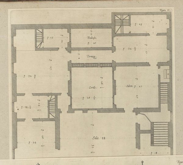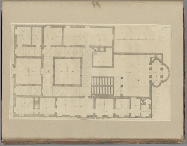 Nicolaes Ryckmans’s ‘Plattegrond van de begane grond van het Palazzo Clemente della Rovere te Genua’ presents a formal study in architectural space. Made with pen and brown ink, it’s a study of lines and volumes that shape our understanding of interior design. The drawing meticulously details the floor plan, emphasizing the geometric arrangement of rooms and corridors. Ryckmans employs linear precision to define each space, suggesting a structured, almost mathematical approach to architectural representation. The cool precision of the ink lines contrasts with the potential warmth one might associate with domestic life, creating a tension between form and function. This tension is further reinforced by the map-like quality of the drawing, inviting a semiotic reading where each line and shape acts as a signifier. The composition encourages us to decode the silent narrative of movement and habitation within the palazzo. This approach transforms a mere floor plan into a visual field ripe with interpretation. Ultimately, it’s the formal restraint and clarity of line that captivate, presenting the architecture not just as a structure, but as a study in spatial organization and symbolic representation.