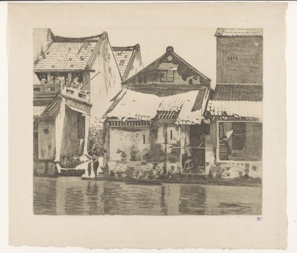 Curator: This is an etching titled "Rivier bij Verdun ten tijde van de Eerste Wereldoorlog," placing it sometime between 1880 and 1930, and it is currently held at the Rijksmuseum. Editor: Destruction, frankly. I see a city on the water’s edge, but buildings have been brutally damaged, a cityscape ripped apart. There's a very somber tone here, all muted greys reflecting in the river. Curator: Indeed, the artist, Bernard Klene, captured the visible damage to infrastructure—likely residential—along the river. But let’s think about the physical act of etching. It involves corrosive materials; the image is literally eaten away from the plate. This echoes the corrosive effect of war. Editor: That’s interesting. To me, the ruined structures, partially mirrored in the water, evoke a sense of lost grandeur, of history tragically altered. The river becomes a kind of Styx, a symbolic boundary marking irrevocable change and the shadows of what used to be. There are no people, only structures. Curator: Exactly, the emptiness, the ruins *are* the subject. Notice how Klene utilizes the etching technique— those cross-hatched lines, the density of the darks… The process allows for this striking level of detail. It’s industrial art documenting industrial warfare's devastating output, which became, itself, mass consumed. The work becomes historical artifact. Editor: And that symbolism runs deep! Water often represents cleansing or renewal. But here, it reflects only the decay, reinforcing a sense of lasting trauma. Even the light seems muted, veiled. There’s very little hope visually offered here. Curator: It offers a critical perspective. Klene is pointing us toward an awareness of wartime consequences through the careful, almost methodical depiction of destruction, but also considers the role the work, the medium, the print itself will serve. Editor: A powerful convergence of medium, message, and lasting symbolic resonance. It leaves you contemplating not just what was lost, but the weight of its memory.