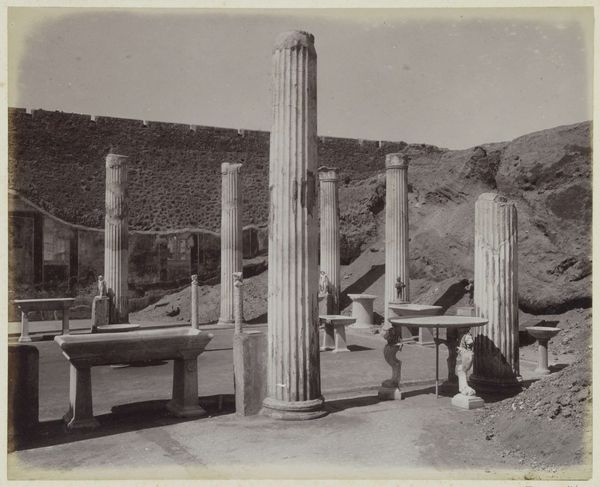 Curator: Looking at this photograph, I immediately feel a sense of timelessness, almost like I’m peering through a crack in history. Editor: Precisely! This gelatin silver print, taken between 1867 and 1870, captures "Restanten van het huis van Oleonio in Pompeï, Italië" – or the Remains of the House of Oleonio in Pompeii, Italy. Giorgio Sommer, the photographer, gives us a window into a moment both frozen and incredibly resonant. Curator: There’s a stark beauty in the ruin. Those towering columns, stripped bare, against the empty sky… it's profoundly moving, and that lone statue gives me pause, juxtaposing loss with stoic beauty. Editor: It’s fascinating to consider how Sommer's gaze interacts with the ruins themselves. He wasn’t just documenting; he was framing a narrative, really. The stark composition directs our attention to the ephemerality of human achievement. You know, how power structures and the elite homes we often prioritize disappear. Curator: And Pompeii itself—the tragedy of its entombment and rediscovery— becomes almost a metaphor for buried histories. Who was Oleonio? What was daily life like here before the eruption? These spaces hint at the lives once lived. Editor: That’s a great way to contextualize the moment, it makes one think, right? In a broader perspective, this work exists within an early exploration of what would become popular archaeological photography. There are conversations about Orientalism, power, erasure, memory. What stories do we tell ourselves about civilizations through art, and, more importantly, whose stories do we neglect? Curator: The use of monochrome really sharpens the focus, removing any potential distraction of colour. You feel like you’re unearthing it with the photographer. I imagine the sun beating down and this immense quiet that surely existed as he captured this view. Editor: It's quite profound when you place yourself there. Curator: Absolutely. The piece pushes beyond merely documenting an ancient space, and begins a much wider discussion on memory, power, and perspective. Editor: In short, a simple photograph really stirs some deeply complex conversations when given proper thought.