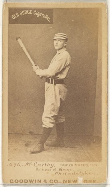 Curator: Looking at this evocative sepia-toned photograph, titled McCarthy, Center Field, St. Louis Browns, from the series Old Judge Cigarettes, a gelatin-silver print created around 1887 by Goodwin & Company, one can't help but admire the stark simplicity. Editor: Yes, stark is the word. It’s somehow melancholic. The texture of the backdrop looks almost like brushed muslin, yet the baseball player has an intensity. You can see how ubiquitous baseball cards would quickly become with marketing endeavors that capitalized on the cult of sports heroes. Curator: Precisely. We have McCarthy, a subject framed formally but made available to average people via an advertisement. And look at the tonal range achieved with gelatin silver printing here. A far cry from the sharp digital images of our age. Each print carries its own subtle imperfections, and a very tactile sense of the photographic processes and labor involved. Editor: It’s fascinating how such a seemingly straightforward portrait becomes a complex cultural document. Goodwin & Company harnessed the emerging popularity of baseball in a growing consumerist culture. Note how this is not just an image; it's intrinsically tied to the production and distribution of Old Judge Cigarettes, insinuating itself into leisure time. We see here the very early stages of advertising using athletes to endorse and promote products, even addictive ones like tobacco, in the popular consciousness. Curator: Exactly! Mass-produced items like this, tucked into cigarette packs, show us a critical moment in the industrialization of leisure and the shifting landscape of visual culture. This object’s humble origins—a small print meant to be collected and traded—belie the immense labor and material processes behind its making, from manufacturing cigarettes, assembling cards, baseball bats and clothes to studio portraits, etc. And Goodwin & Company certainly reaped a huge financial profit from baseball, further demonstrating that these material means become valuable far beyond what is evident here at first sight. Editor: Right, it's all connected. Gender is critical to note, too: who gets to participate in sport as recreation or business, and how the male sporting image intertwines so inextricably with marketing and capitalist aspirations of power at this moment in American history. A baseball player’s photograph as an inducement within cigarette packs touches on masculinity, consumerism, leisure, addiction, and cultural production at the fin-de-siècle. Curator: Looking closely reveals that even the mundane objects can tell very expansive, interwoven stories of capitalism. Editor: Yes, it provides us a peek into the cultural values that were forming around turn of the century industrial America, an insightful consideration of how marketing began capitalizing on entertainment and everyday realities.