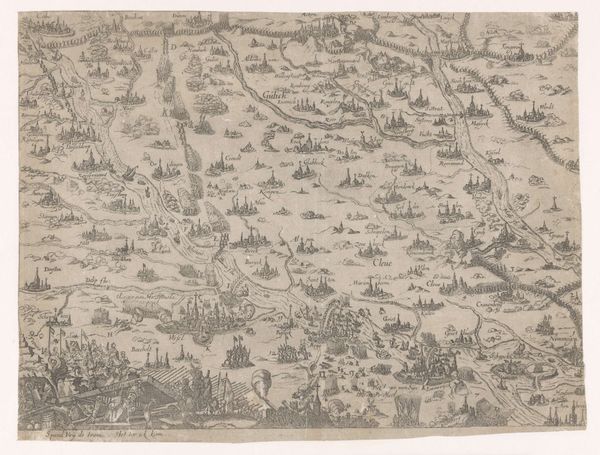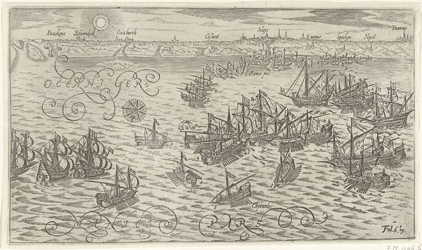 Bartholomeus Willemsz. Dolendo created this print of the naval battle of Cadiz in 1596. Look at how the composition is structured by dense clusters of ships against the detailed rendering of the landscape. Dolendo uses etching to create a tableau where lines define the forms of the ships, the waves, and the topography of the land. The detailed rendering, with its careful articulation of shapes, creates a sense of depth and spatial complexity, which offers viewers an immersive experience into the historical event. Consider how the lines direct the viewer's eye, engaging us with the print's narrative, almost inviting us to decode its visual language. We can consider how the print’s representational strategy embodies the period's understanding of naval power and territorial claims. Each element is carefully rendered to reflect the battle, acting as both a historical record and a strategic representation of power. The formal structure of Dolendo's print thus functions as a cultural document, inviting ongoing interpretation and historical contextualization.