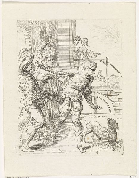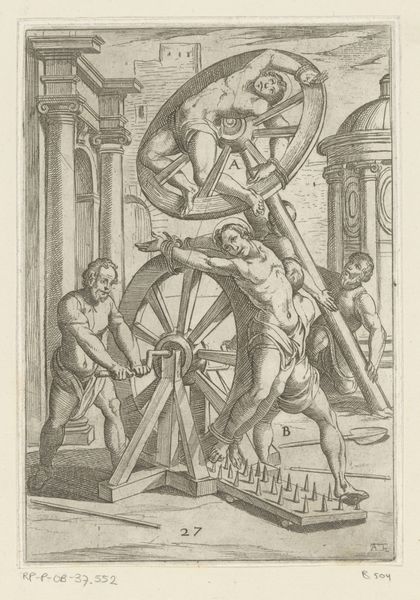 Curator: Oof. That gives me the chills just looking at it. Editor: Indeed. Here we have a work titled "Foltering op vat met staven," or "Torture on a Barrel with Rods," attributed to Antonio Tempesta and created sometime between 1565 and 1630. It's currently held at the Rijksmuseum. The image, rendered using intaglio and engraving, captures a scene of, well, torture. Curator: Torture is right. Makes you think about the range of human experience, doesn’t it? From laughing children to…this. Though, the cherub riding the eagle gives it a surreal juxtaposition, don’t you think? Editor: Certainly. The composition, arranged with a sharp sense of perspective, forces the viewer to confront the horror directly. The figure strapped to the wheel is centrally positioned, making his suffering unavoidable. Note the precise linework—especially the details defining the muscles of the victim and his torturers. The artist uses this linear precision to enhance the scene's brutal realism. Curator: And there's an interesting bit of narrative happening with that wheel. You see how the man’s placed right over what looks like the letter “A”? It’s subtle, but I feel like it adds an allegorical layer, some symbolic depth to the scene. Like a twisted sort of branding. Editor: That's an insightful observation. The "A" could indeed be interpreted as symbolic branding, perhaps signifying Adultery, or another imputed crime worthy of such extreme punishment, an indicator of shame permanently affixed to the victim. Or even *auctor*, the author, pointing to who bears responsibility. Curator: Or maybe Tempesta just felt like popping a letter in there for giggles? I’m just sayin', ya never know. It feels kind of dreamlike. Maybe Tempesta had a pizza with a missing topping, you know? Made him add something extra to the next work, too. What do you make of the location? Columns and classical structure give a certain historical or maybe even theatrical element? Editor: The classical architectural setting does lend the scene a sense of historical gravity. It elevates a common scene of brutality, or perhaps hints at the systematic nature of torture in so-called "civilized" society, all underscored through form and its arrangement in space. Curator: Well, whatever Tempesta’s message was, he really sticks the landing here. Makes ya think twice about behaving! I feel more pensive now; like, I need a Renaissance fair, stat. Editor: Indeed, a disquieting yet technically impressive artwork. It provides valuable insights into historical punishment. The careful formal choices of this baroque print elevate it beyond mere reportage of a torture scene into a chilling statement on human nature, and of humanism’s limits.