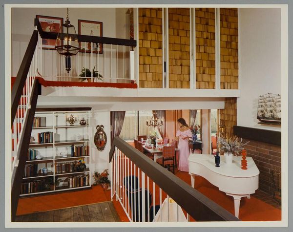 Curator: This captivating image, simply titled "Untitled (interior with gold carpeting)," comes to us from Del Carlo Studio. It's held here at the Harvard Art Museums. Editor: My first thought? Mid-century glamour, but with a distinctly unsettling stillness, like a stage set waiting for a play that will never begin. Curator: I agree; there is a palpable sense of suspended time. The gold carpeting, in particular, speaks to aspirations for luxury, while also potentially symbolizing material wealth becoming somewhat suffocating. Editor: And that dog! It's like Cerberus guarding the gates of… well, very plush domesticity. Is it a real dog, or an uncanny sculpture? It feels crucial to the image’s mood, somehow. Curator: The dog, real or imagined, does add a layer of complexity. Dogs are often symbols of loyalty and protection, here perhaps alluding to the protective, yet potentially isolating nature of wealth. Editor: Maybe it's a commentary on aspiration, or the gilded cage effect? Either way, I'm left wanting to know the story behind that doorway. Curator: Indeed, its symbolic weight is quite thought-provoking.