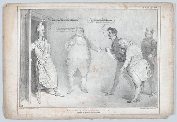 Editor: This is John Doyle’s "A Greenwich Pensioner!" from 1838, a pencil drawing or print currently residing in the Metropolitan Museum of Art. I’m struck by the stark contrast between the figures; they seem to represent different social classes or perhaps different eras. What’s your read on this? Curator: Doyle was known for his political cartoons, and context is crucial here. "Greenwich Pensioner" refers to veterans residing at the Royal Naval Hospital, a charitable institution. This print likely satirizes the changing social landscape of 19th-century England. Editor: So the "pensioner" is maybe the figure being observed by the others? Curator: Precisely! Consider the figures on the left, gossiping, clearly mocking the man passing by. Their clothes, the language in the speech bubbles...they’re rooted in an older, perhaps dying, order. The figure in the center represents this new era, his direct gaze reflecting changing social values and class structures. The observer on the right seems equally alienated. Does that read as a statement on social change to you? Editor: It does, especially the body language – the pensioner strides forward, self-assured, while the others are either rooted to the spot or bundled up. Curator: And the gaze, the direction of the figures. Consider also the role of institutions like the Greenwich Hospital. What did it mean to be "taken care of" by the state in this period? Was it empowering, or disempowering? Editor: I guess it's both. It provides for the veterans but at the expense of being dependent on the institution itself, and the judgment that comes with that. This definitely sheds light on how art can act as a historical record. Curator: Exactly! Art engages actively with the issues of its time, not as passive illustration. It prompts us to consider how power, class, and societal perceptions are visualized and circulated. I always learn something from a closer reading. Editor: Definitely! Thank you!