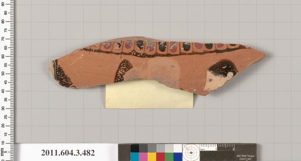 Curator: We're looking at terracotta rim fragments of a kylix, a drinking cup crafted around 530 BC, possibly by the artist Makron. It’s currently held in the Metropolitan Museum of Art. Editor: Immediately striking is the contrast – the stark black background against the reddish figures. It lends the fragments a powerful graphic quality, even in their incomplete state. The lines are bold, confident. Curator: The red-figure technique is particularly crucial here. It was a revolutionary approach where the figures are reserved in red, while the background is painted black. It allowed for finer details to be rendered, enhancing the narrative possibilities of the imagery on pottery. Editor: Narrative, yes, I see a musician, head in profile playing the flute, but the broken bits... They make me think of a puzzle or perhaps evidence of daily use, even ritual use of ancient peoples of the time. This ceramic work carries so much. Curator: Indeed. The context of symposium, or gatherings where these cups were used is also of import. They were often decorated with scenes meant to amuse, provoke, or engage the drinkers. The fragmented form speaks volumes too; it is rare. It invites us to contemplate the rituals of life that continue in the now. Editor: Thinking about those gatherings gives this image its full voice. The fragmented vines could echo the effects of that consumption - not only in visual terms of drunkenness or of inebriation, but also in a cultural lens as symbols. There's so much embedded. Curator: The incompleteness only heightens the impact. We're left to piece together stories, to imagine what revelries this kylix may have been a part of centuries ago. Editor: A fascinating look at function meeting form, then fading from time. A relic of shared pleasure that now allows for silent and solitary engagement in an exhibit like this.