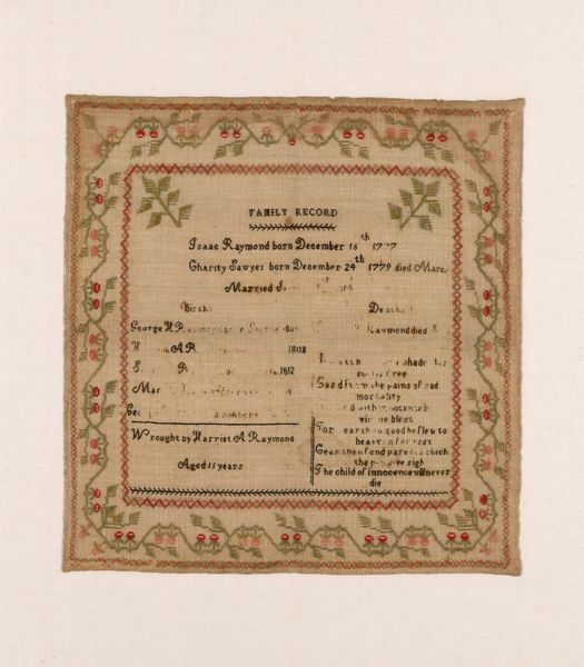 This sampler was made by Mary Ann Sadler, using cross-stitch on linen. The work employs a deep red thread against the neutral tone of the linen, creating a stark contrast that draws attention to the complex arrangement of numbers and text. The composition, a blend of mathematical equations and personal details, presents a grid-like structure, framed by a decorative border. At first glance, it appears to be a simple exercise in arithmetic; however, delving deeper, the sampler can be understood as a structured narrative. It highlights the convergence of education, skill, and identity in the context of a young woman's life. The mathematical problems demonstrate her intellectual training, while the act of stitching itself reflects her domestic accomplishments. The meticulous execution of the piece, from the precise stitches to the calculated layout, suggests a structured approach to learning and self-expression. The sampler destabilizes traditional categories, combining elements of craft, education, and personal identity, creating a space for the ongoing interpretation of its meaning.