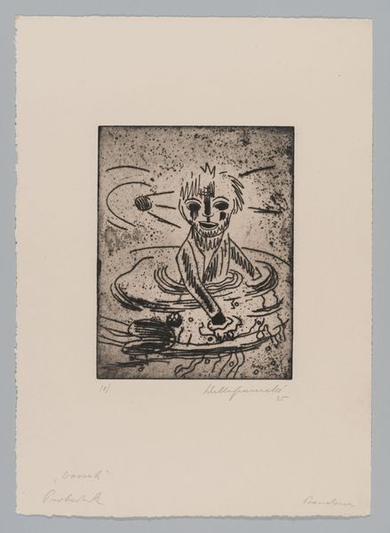 Curator: Here we have Edvard Munch’s "On the Waves of Love," created in 1896. It's a charcoal and etching print on paper, currently residing at the Art Institute of Chicago. Editor: What immediately strikes me is the almost dreamlike quality evoked by the blurring of the figure with the waves. The tonal range is limited, which concentrates my focus on the sinuous line work depicting the water. Curator: It’s fascinating to consider this print in light of Munch’s broader interest in psychological landscapes. Notice how the female figure is partially submerged, merging with the undulating lines that represent the water. This merging visually suggests a symbolic dissolving of boundaries between self and emotion. The title tells us this has something to do with ‘Love’. Editor: Exactly, that fluidity mirrors, perhaps, the intoxicating, all-consuming nature of passionate emotion. I see how the reductive approach simplifies form to pure linear expression and enhances this feeling of being overwhelmed, of almost drowning in the emotion. Curator: Consider, too, that the print medium itself makes this artwork more widely available. Munch, exhibiting often in Berlin in the 1890s, would likely have encountered an audience keen to receive artworks probing deeply into psychic and existential issues. So, beyond an exploration of aesthetics, it’s about making a statement to this segment of the population through the circulation of his printed image. Editor: The way the lines coalesce to form a semi-nude figure with a distinct curve of her neck... there's a subtle erotic charge. Even the gentle curve and the soft modelling suggest more carnal intent than some tragic fate. Curator: I find your focus revealing about modern aesthetic taste! I can appreciate how one might respond, and also think the turn-of-the-century viewer might equally see her drowning, literally, or emotionally, in love’s tidal forces. Perhaps Munch seeks a tension between both sensations: terror and delight, in how we encounter this force in the world. Editor: That ambivalence gives this composition real power. The tension you note definitely intensifies the image; that's really thought-provoking! Curator: Precisely. It’s a powerful depiction of human emotion experienced not as individual, but also bound within a broader public conversation concerning the psychological depths and anxieties of modern life.