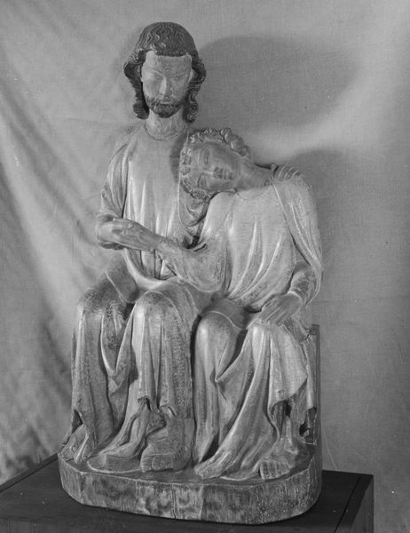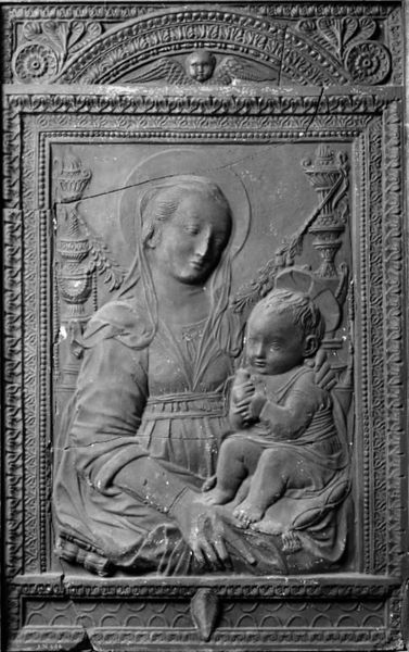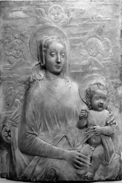 Editor: This is a marble sculpture of the Madonna and Child by Lorenzo Ghiberti, dating from the 15th century, here at the Metropolitan Museum. It strikes me as rather melancholic. What do you see in this piece, beyond the obvious religious iconography? Curator: Beyond the immediate depiction of maternal love and religious devotion, I see a work deeply embedded in the socio-political currents of its time. Ghiberti was working in Florence during the early Renaissance, a period of intense artistic innovation but also significant social upheaval. This piece, while seemingly traditional, speaks to the complex role of women – particularly Mary – within a patriarchal society. Editor: In what way? Curator: The downcast gaze of the Madonna, the almost sorrowful expression... It evokes not just piety, but perhaps also a sense of resignation, or even the burden of her predetermined fate. How might we interpret this as a commentary on the limited agency afforded to women within religious doctrine and societal structures of the 15th century? The "Ave Maria" inscription anchors it in prayer, but could it also be a yearning, a silent plea? Editor: So, you’re saying it’s not just about religious devotion but potentially about the constraints placed on women's lives? Curator: Precisely. By considering feminist theory and interrogating the artwork’s historical context, we can uncover these hidden layers of meaning, engaging with the complex interplay between art, religion, and gender. Even the child seems almost subdued, already burdened by the weight of expectations. Editor: That's a fascinating way to look at it. I hadn't considered the socio-political implications. Curator: It's vital to remember that art doesn’t exist in a vacuum. By looking at it through the lenses of gender, race, and class, we can gain a much richer understanding. Editor: Thank you. I will never look at another Madonna the same way.
