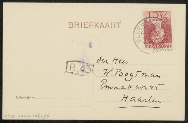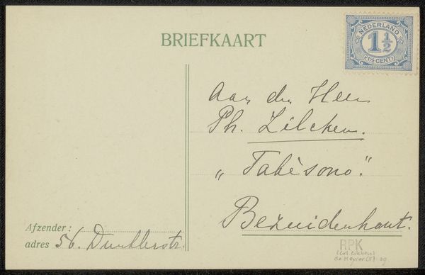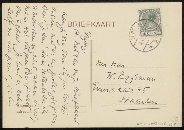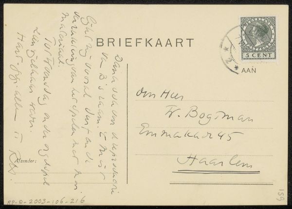 Editor: Here we have Richard Nicolaüs Roland Holst’s "Briefkaart aan Willem Bogtman," likely from the mid-1920s, made with ink on paper. It feels so simple, almost like a found object rather than a deliberate artwork. What do you see in this ordinary little postcard? Curator: It’s deceptively simple, isn’t it? Think about the act of sending a postcard in the 1920s. It wasn’t just a practical means of communication; it was a social gesture, a conscious performance of connection and presence. Roland Holst, sending this to Willem Bogtman, engages in that performance. Consider the potential for queer readings, noting the delicate penmanship. Is there an intersectional exchange happening here between identity, artistic expression, and communication across space? Editor: Queer readings, that's interesting! I hadn’t considered it beyond the surface level. I was so focused on the mundanity. Curator: Mundanity is fertile ground for meaning! A postcard resists the seriousness associated with higher art forms, so it allows for alternative forms of interaction. Roland Holst can explore connections to Bogtman more playfully. This ordinary object invites questions: what kind of relationship did these men have, and how are these power dynamics communicated through seemingly casual gesture of correspondence? Editor: So the actual content of the card becomes almost secondary to the act of sending it, and what it represents about their relationship and social context? Curator: Precisely. This mundane card reflects the network of queer artistic communities during this period. Considering it in a contemporary framework, what aspects feel radically honest in our social media world? Editor: That definitely gives me a fresh perspective! I initially saw it as just a note but can appreciate the multiple meanings within such a humble work. Curator: Exactly! By understanding these seemingly insignificant art artifacts, it allows us to decode and appreciate complex meanings hidden in plain sight.