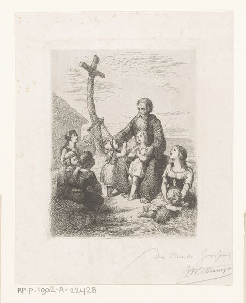 Abraham Teerlink created this pencil drawing portraying an Italian peasant woman with her children kneeling before a roadside cross. This cross, a ubiquitous symbol of Christianity, speaks to the religious devotion pervasive in rural Italian life during Teerlink's time. But the cross is more than a mere emblem of faith; it is a crossroads of cultural memory. One might recall the ancient Roman custom of placing votive offerings at crossroads, a practice that Christianity later adapted, superimposing its own sacred symbolism onto existing cultural landscapes. The act of kneeling—a gesture of supplication and humility—resonates across centuries, from ancient rituals to Renaissance paintings, each iteration layering new meanings onto the collective consciousness. The emotional weight of the image lies in its quiet reverence, tapping into the viewers' own subconscious associations with faith, family, and the enduring power of tradition. The cross's symbolism continually evolves, adapting to the ever-changing human experience.