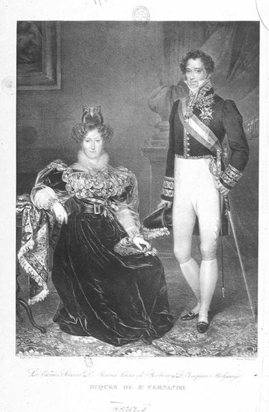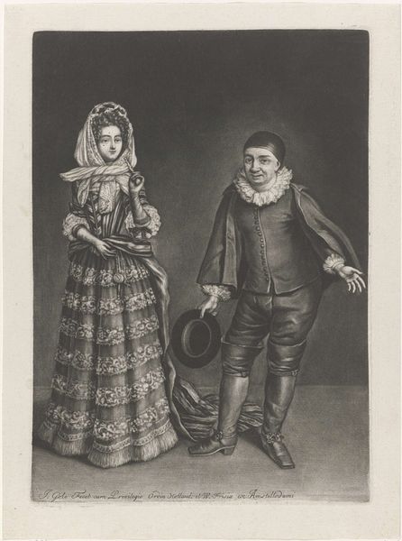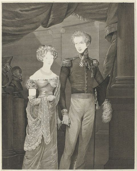 Editor: Here we have “Coming from Church,” an engraving by Jean-François Portaels. I’m immediately drawn to the couple's formal attire and hand-holding. It feels…theatrical almost, staged. What do you see in this piece? Curator: The joining of hands speaks volumes, doesn’t it? Beyond the obvious connection, consider the layers of meaning within that gesture. This image feels like a carefully constructed tableau. The man's dress, almost somber, contrasts beautifully with the woman’s ornate, lace-laden costume. Note the shared gaze, slightly averted. It's not just about affection; it’s about presenting a unified front, wouldn’t you say? Editor: That’s a great point about them presenting a unified front. It does look very performative, like they're intentionally presenting an image of piety and togetherness. Curator: Precisely. The attire reads as specific to a region, perhaps a declaration of cultural identity as much as a display of wealth. These visual markers tell us much about belonging and perhaps even aspiration. Does the formal presentation of this embrace hint at something beyond simple affection, perhaps a more calculated public role? Editor: It could definitely signify a public role, I did not consider that. All the specific details such as clothing must hold specific local, if not political, relevance that would've been easily interpreted by viewers during the Romantic Era. Curator: Think of these portraits as not just representations but declarations. These declarations allow cultural values and social norms to speak volumes even now. What values, do you think, might the artist be signaling to their audience? Editor: Definitely about order and the importance of traditions, so valuable during this Romantic Era. Thinking about it all makes me realize how meticulously constructed every aspect of this image is, and I originally didn't even pick up on any of that!