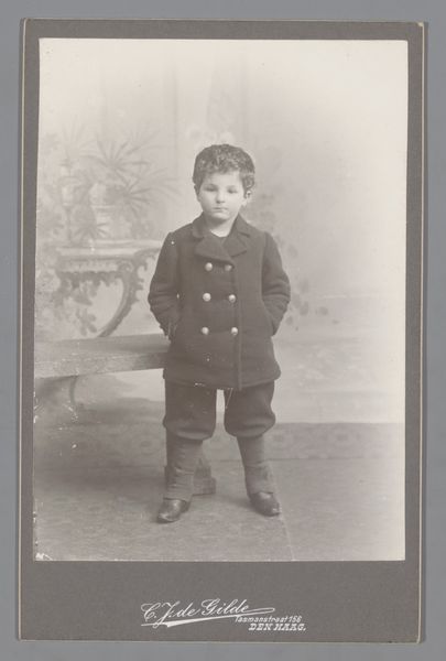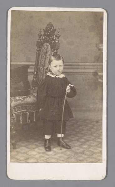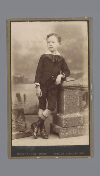 Editor: This is a photograph entitled "Portrait of an unknown boy with a staff in his hand, standing next to a balustrade", taken sometime between 1876 and 1906 by F. Meeus-Verbeke. It has such a staged, formal quality to it. What strikes you when you look at it? Curator: The composition immediately draws my eye. Notice how the artist has arranged the boy’s body in relation to the balustrade. His posture creates a series of intersecting diagonal lines. The angle of the staff mirrors the angle of his leg, which produces a certain visual tension. The formal qualities evoke that academic approach. Editor: Visual tension, that’s a great way to put it. Is there tension in the subject himself, or just in the shapes? Curator: A keen eye, young scholar. Indeed, look at the contrast between the boy's soft features and the hard, geometric shape of the balustrade, the blur effect behind him compared to his defined tailoring. The texture adds another layer. And of course, the sepia tones create a tonal balance throughout the composition. These juxtapositions make us question the context. Is he comfortable? Is it staged? It certainly plays a part in a dynamic interplay. Editor: That's a great analysis! The way you described those contrasts really helps me appreciate the picture in a new light. Thank you. Curator: It is through analyzing these contrasts that we learn to ‘see’ in new ways. It’s an enriching piece of observation.