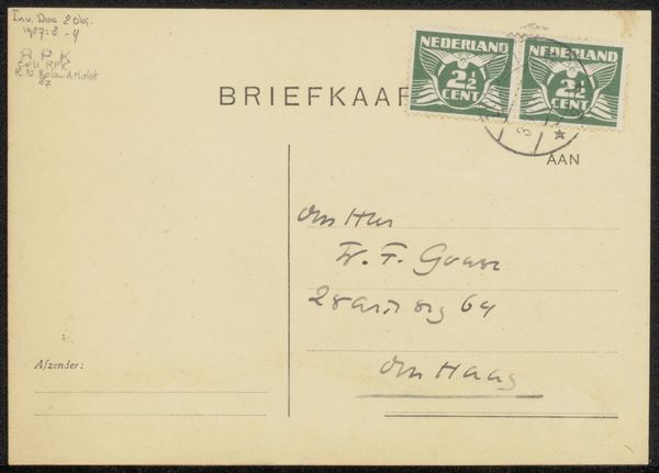 Curator: This is a postcard titled "Briefkaart aan Willem Bogtman" potentially from 1924, attributed to Richard Nicolaüs Roland Holst. It's crafted using ink on paper. What are your initial thoughts? Editor: Stark. Severely devoid of figuration, it's the aesthetic of utility – a surface waiting to be adorned, an invitation of sorts. A purely material, utilitarian object shaped by the act of sending and receiving. It speaks volumes, surprisingly. Curator: Indeed. One might analyze the composition of the handwriting, the contrast of the dark ink against the pale paper, the geometry of the postal stamp. Editor: I'm drawn more to the economic reality embedded in its very existence. The paper itself – likely mass-produced – speaks to a growing consumer culture. The ink, a commodity readily available. The stamp, a state-controlled artifact facilitating communication within a specific social and political framework. It is everyday culture. Curator: Certainly, we see the mechanisms of communication, but also the artist's personal expression. The handwriting possesses a unique character, reflecting a conscious stylistic choice. This isn't simply about relaying information. Note also the subtle placement of the stamp; not precisely aligned, lending the piece a sense of immediacy. Editor: Agreed, but that seeming 'immediacy' belies the industrialized infrastructure necessary to produce both the card and the means of delivering it. And the act of address. Note, it isn’t sent ‘by’ but ‘to’, suggesting the passivity in cultural exchange, with capital pulling all the strings, Curator: An interesting reading. Editor: My lens casts value on all aspects of the process. Mass production has made a commonplace event into a form of design worthy of display. What could once only happen to wealthy patrons is now a purchase at the store down the street. Curator: Precisely! This examination reminds us of the interconnectedness of art, social context, and even mundane material processes. Editor: And illuminates the artistic in all objects when they find their stage.