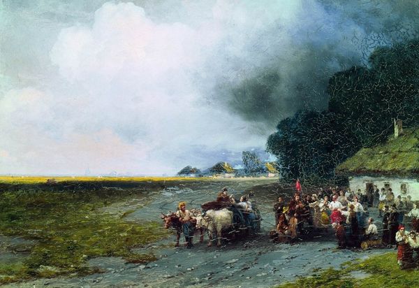 Editor: We’re looking at "Carriage in a Storm," an oil painting, possibly tempera, attributed to Ivan Konstantinovich Aivazovsky. The scene is incredibly turbulent; the wind whips at the trees, and rain seems to obliterate the background. I wonder, what are your thoughts when you see this painting? Curator: The furious brushstrokes portraying wind and rain draw my attention to Aivazovsky's materials. Think about the accessibility of oil paint at the time, and who this scene *really* caters to? Do you see how he uses dramatic weather not as mere spectacle, but to highlight the precarity of travel and trade, the carriage seemingly at the mercy of the elements? It makes you consider who controls the means of mobility, and at what cost, doesn’t it? Editor: It does! I hadn't thought about the social aspect of simply getting from one place to another in a landscape like this. The materials really dictated the experience. Curator: Precisely! The materiality and mode of conveyance become powerful signifiers of class and capability here. We see not just a romantic landscape, but the infrastructure and labor required to overcome such dramatic conditions. How is the light, almost religiously sublime in effect, in direct contrast to the potential horrors of what could come? Editor: That makes so much sense. The divine light also illuminates the hard labor that this landscape and scene imply, maybe. Curator: Exactly. And what of the horses, the coachmen? These elements all rely on the specific use and presentation of these available, crucial, materials and persons. Editor: I see the painting in a new light now, pun intended! I initially saw a storm, but it’s really about systems and the relationship between people and their world. Curator: Indeed. The sublime spectacle cloaks deeper questions of social and material power.