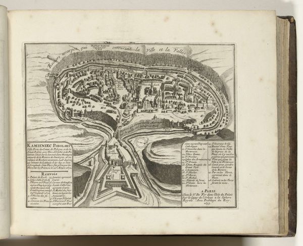 Curator: Today we're looking at a print titled "Plattegrond van Kamien Pomorski, 1726", made around 1726. It’s currently held in the Rijksmuseum collection. Editor: At first glance, I see this fascinating bird's-eye view – almost unsettling with its strategic detail. It gives you this strange, omniscient sense of power. It also looks meticulously crafted with ink. Curator: Precisely. It is an engraving. Consider how such prints disseminated knowledge and power structures. Mapmaking during the baroque era wasn't merely about geographical accuracy; it was about asserting control, projecting an image of a well-ordered, manageable domain, usually for trade and war planning. Editor: Definitely. The surrounding text blocks situate it – these are documents of administration and early forms of social engineering. How does the act of surveying and rendering a space affect the lives of people who inhabit the space? The creation of a visual inventory enables easier control and oversight from colonial powers. Curator: Think too about the material cost: the paper, the ink, the engraver's labor. Prints like these were circulated, consumed by elites, often depicting colonial gains. Consider also who owned and commissioned such artworks, and who was thus excluded from the consumption or critique of these kinds of objects. Editor: The choice of viewpoint also establishes a hierarchy – a separation from lived experiences on the ground, especially considering we only know it as the work of someone “anonymous." Who makes decisions about land use, planning, and urban development then becomes paramount. I imagine such visual tools allowed city developers to enforce and maintain policies affecting communities. Curator: Precisely. Its sharp, precise lines—evidence of the engraver’s skilled labor—emphasize function. These choices serve political and economic ends above all, influencing relationships between ruling structures, access to resources, and class divides, shaping communities over time. Editor: Absolutely. Examining the history allows one to connect baroque sensibilities to broader historical themes like imperialism, power, wealth, and visibility – it all has lasting repercussions on populations to this day. Curator: And the anonymous creator allows us to look at the production value itself to ask better questions, rather than simply appreciating "art". Editor: Exactly, by deconstructing its layers, we unlock its significance to reveal a visual instrument of power with lasting effects.