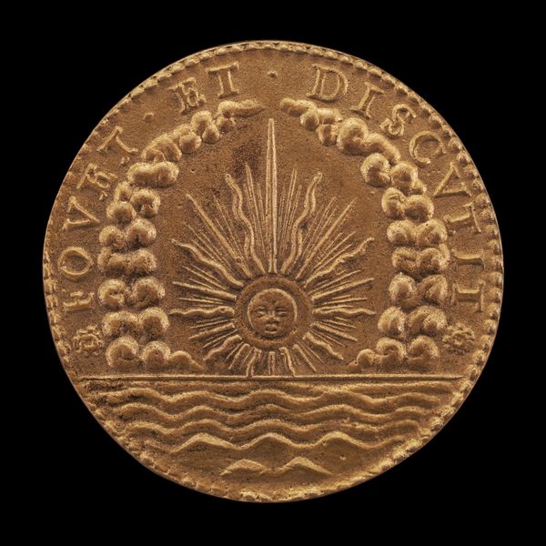 Curator: This intriguing medal, crafted in metal relief during the 16th century, depicts lightning striking a tower amidst the sea. Editor: The composition is immediately striking, literally and figuratively. The crisp, almost miniaturized, carving creates a sense of drama, heightened by the contrast between the stoic tower and the raw energy of the lightning. Curator: Let's break it down formally. Note the circular format, drawing our eyes around the inscribed text, which acts as a frame for the central scene. The tower rises vertically, a strong, stable form bisected by the dynamic, chaotic lightning bolt. What do you make of that compositional tension? Editor: For me, it's potent with symbolic weight. Towers throughout history often represent stability, power, even hubris. And of course, lightning has been equated with divine retribution since the dawn of time. Perhaps this is a visual warning about the limits of earthly power when confronted by fate? Curator: An astute observation. Consider how the texture plays a crucial role as well. The meticulous carving gives the waves and jagged rocks a palpable sense of movement and danger, underscoring the tower's vulnerability despite its imposing structure. Editor: Absolutely. The artist seems intent on revealing universal anxieties surrounding human ambition and nature’s destructive forces. These themes have particular resonance during times of intense political or religious upheaval. Perhaps this object carries anxieties specific to its commissioner. Curator: That raises intriguing questions regarding its creation. Its purpose remains elusive, an object imbued with both artistic ingenuity and perhaps personal, coded messaging. Editor: Yes, a puzzle sculpted in miniature. Ultimately, “Lightning Striking a Tower in the Sea” captures a compelling moment of destruction but leaves the narrative open to interpretation. Curator: It is, at its core, a study in contrasts, skillfully rendered to convey a sense of profound, and timeless, turmoil.