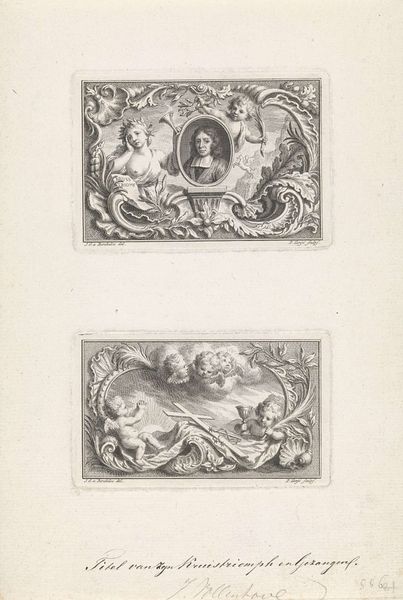 Jean Pelletier created this print titled "Medaillons, hoornen des overvloeds en putti" whose date is not known. The two designs presented have a striking similarity in their structure. Each is defined by a rectangular frame, meticulously detailed, creating a sense of containment. Inside these frames, circular medallions take center stage. The upper medallion features a classical profile portrait, exuding a sense of nobility. Conversely, the lower medallion showcases a lively scene with putti, figures embodying innocence. These figures are framed with garlands and a complex interplay of draped fabric, which enhance a sense of movement within the static print. The repetition of circular forms introduces a rhythm that speaks to broader themes of balance and order characteristic of Pelletier’s era. Despite their decorative function, Pelletier's formal approach invites us to consider the deeper cultural values embedded in 18th-century design.