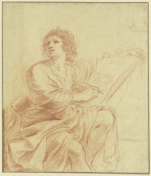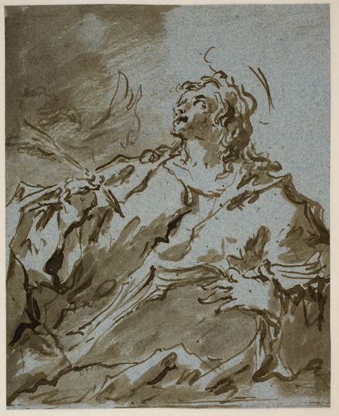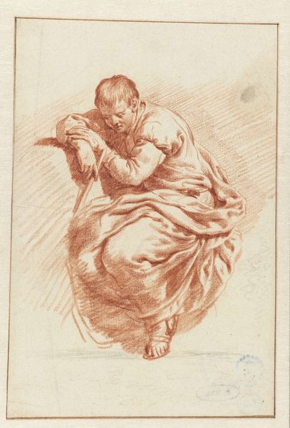 Editor: This is "Kneeling Saint," a pen and brown ink drawing from between 1762 and 1777, by Etienne de Lavallée-Poussin, housed here at the Rijksmuseum. There's a vulnerability and softness that strikes me, conveyed by the almost monochromatic palette. What catches your eye in this piece? Curator: The work certainly showcases an intriguing interplay between form and line. Consider the way the artist employs contour to define the figure, but does not slavishly adhere to a purely representational mode. The drapery, for instance, while suggesting form, possesses an almost abstract quality in its rendering. Do you perceive a tension between the literal and the non-literal? Editor: I see that. The way the fabric folds aren't perfectly realistic; they're more like suggestive gestures. I initially focused on the figure's emotion, but you're right, there’s a different conversation happening with the lines and shapes themselves. Curator: Precisely. The artist is actively shaping our perception through formal means. Furthermore, note the strategic use of wash. The areas of deep shadow serve not merely to depict light, but to flatten certain planes, directing our gaze according to the artist's intention. Is there a particular area where you see this effect most powerfully? Editor: Definitely around the figure's legs and the triangular patch on the left. It almost pushes the figure forward. Curator: An astute observation. It is through these compositional decisions that the work transcends mere devotional imagery and enters the realm of formal innovation. Editor: I see now how focusing on just the visual language unlocks a whole other level of understanding and intention. Thanks! Curator: My pleasure. There's always more to find with careful looking.