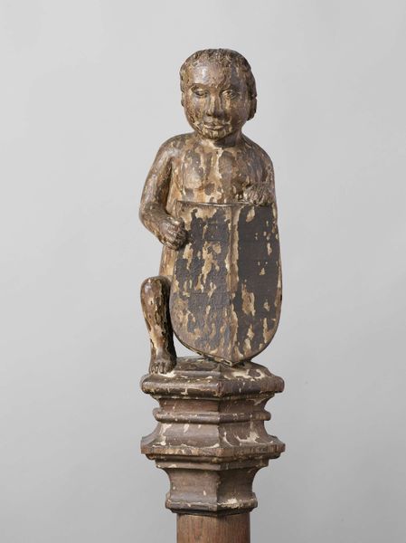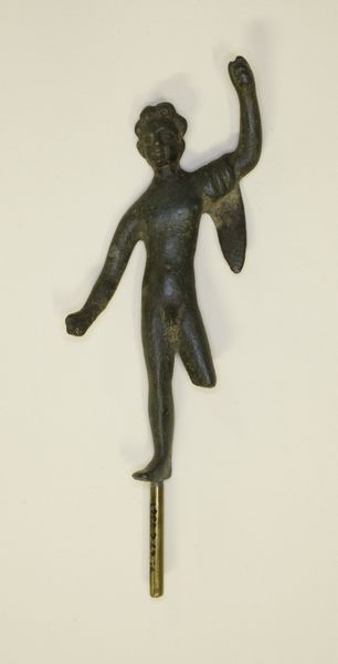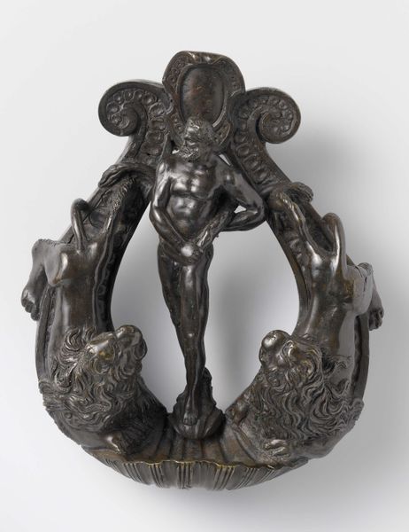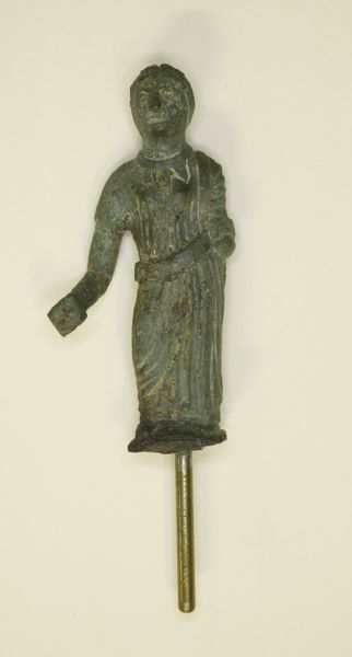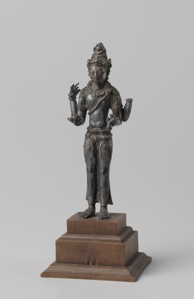 Curator: Let's turn our attention to this bronze sculpture titled "Shiva, Parvati, and Ganesha," dating back to the 9th or 10th century. It's currently held at the Rijksmuseum. Editor: My immediate reaction is one of serenity, despite the intricate details. The patina of the bronze lends a quiet dignity. The scale feels intimate, drawing you into the delicate forms. Curator: Precisely. The fact that this sculpture, though depicting divine figures, was crafted using the lost-wax casting process speaks volumes about the labor and communal effort involved. The availability and control of bronze resources during that period also provide valuable context. Editor: Indeed, but I'm particularly drawn to the formal qualities. The balanced symmetry of the figures, especially Shiva's multiple arms, creates a visual harmony. Note the circular halo behind his head – a recurring motif signifying divinity and perfection. And see how the sculptor balances geometric forms with flowing lines to create the garments, ornaments and crowns? Curator: And how these geometric forms intersect and inform labor and the economy—from metal ore extraction and trade, to the workshops that fabricated these icons to supply ever growing Hindu institutions throughout Southeast Asia. Think about the trade routes! This artwork offers so many important historical threads to follow. Editor: All interwoven, undeniably. Even the patina on the bronze itself speaks of time, wear, and the surrounding environment – a testament to its physical and cultural journey. How this artwork persists structurally and semiotically gives it potency. Curator: Reflecting, this sculpture serves as an entry point for understanding complex social and economic relationships tied into the material realities of ancient Southeast Asia. Editor: From my perspective, beyond history, this object offers a powerful study in contrasts. Intricate details, smooth texture, stillness and symbolic dynamism all work together beautifully. It truly elevates bronze work into an important art.