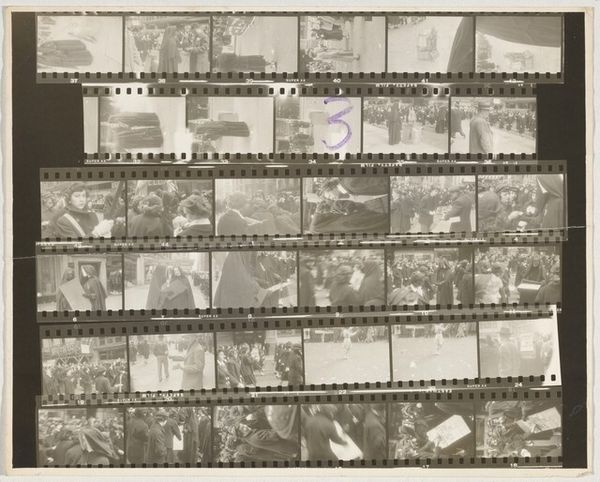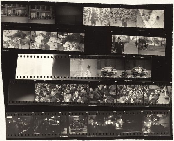Robert Frank made this gelatin silver print, "Arrival of the Queen--London 1," sometime in the mid-20th century. It's a contact sheet, meaning that the images are the same size as the negative, and it shows us his process: he's working something out, maybe telling a story. What strikes me is the contrast between the individual and the crowd. Look at the frames with a few figures in top hats. Then, look at the rows and rows of people. The faces are just a sea of white dots. Even in the frames where faces are visible, they are not looking at us. They are looking towards the Queen, a collective gaze. The grainy texture of the image adds to this feeling of distance and anonymity. Frank seems to be saying something about the nature of power, the individual versus the collective, and the way we look, or don't look, at each other. It reminds me of Winogrand, street photography, but maybe with a darker mood. It's open-ended.
