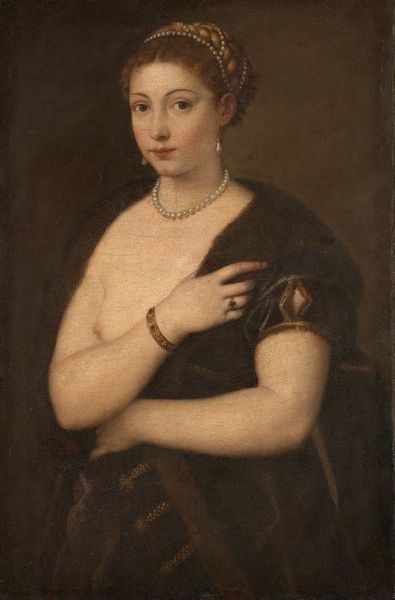 Editor: Here we have Paolo Veronese's "Portrait of woman with a child and a dog", created around 1548 using oil paint. The painting has such a subdued feeling. The muted tones, and the rather somber look of the woman, it almost feels like something is just… off. What are your thoughts? Curator: What I see are layers of societal expectation embedded in the very fabric of the painting. A mother, child, pet - these images become archetypes through repeated visual representation. Does the artist portray a unique bond, or a universally understood concept of family? Editor: That’s an interesting point. I was so focused on the individual expressions, I hadn't thought about it in such broad terms. So the dog… is that a symbol, then? Curator: Indeed! Dogs have signified loyalty, wealth, or even domesticity for centuries in Western art. Its presence tells us something, even if subtly, about the woman’s position or desired self-image. Does the presence of the child create a different perception, playing on different concepts of belonging? Editor: That’s fascinating! And it makes me consider how intentional these symbols are and how they play into cultural memory and what society wants us to think a mother "should" be. Thanks for expanding my understanding! Curator: The symbolic weight of even seemingly simple images deepens with every era. I see something new each time, which reinforces how vibrant this memory through images can be.