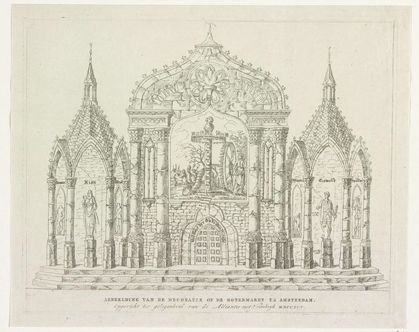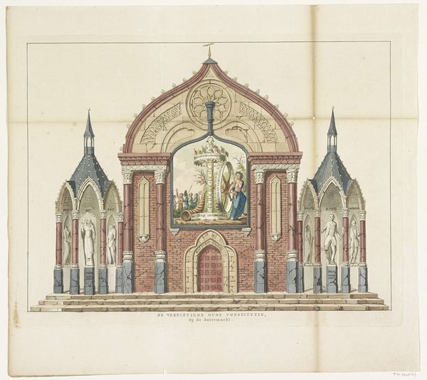 This undated drawing shows the painted decoration in the Botermarkt in 1795. The anonymous artist used ink and watercolour to represent a building of sorts, displaying neoclassical architectural elements and iconography related to the Batavian Revolution. Visually, the work is structured around a symmetrical arrangement. Side pavilions flank a central structure, creating a balanced, almost ceremonial presence. The muted palette of ochres, reds, and greys evokes a sense of solemnity appropriate for a revolutionary context. The detailed rendering of architectural components—columns, arches, and statues—suggests an effort to legitimize the revolutionary fervor through associations with established classical forms. The work destabilizes traditional notions of power and authority. By invoking classical imagery while celebrating the destruction of the old constitution, the piece engages in a semiotic dance. Here, the visual vocabulary of tradition is employed to advocate for radical change. The subtle use of watercolor washes emphasizes the underlying tensions, making the work not just a historical document but also a complex statement on revolution, representation, and the reinvention of cultural values.