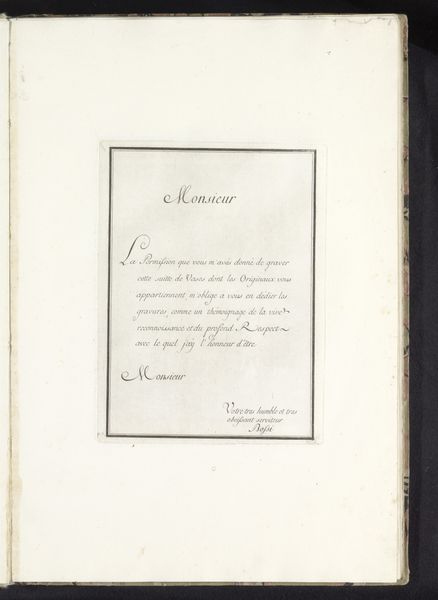 Editor: This is a print from an album titled "Album met twee series ornamentprenten" by Andrea de Bernardis, created in 1787. It's a series of ornament prints rendered as engravings. What really catches my eye is the script – it’s so delicate and intentional. How would you interpret this work, considering its historical context? Curator: Well, seeing this from a historian's perspective, I'm immediately drawn to the Neoclassical style and what it represents. In the late 18th century, Neoclassicism was much more than just an aesthetic; it was deeply tied to social and political aspirations. Notice the precise lines, the balanced composition, the attempt to recapture a perceived “golden age” of the classical world. Editor: Right, the way it’s almost trying to revive a past era… Curator: Exactly! Consider the socio-political landscape at the time. The Enlightenment was in full swing, challenging the established order, but these idealized ornament prints also indirectly serve as a quiet commentary on civic virtue and order amid societal upheaval. What sort of audience do you think this album was intended for? Editor: Probably other artists or wealthy patrons, for inspiration… something functional? Curator: Precisely. Ornament prints like these would have circulated amongst artisans and designers to shape tastes, thereby propagating and reinforcing a certain visual language within the culture. So this "simple" book ends up playing a vital role in the construction of public visual culture and political values. Editor: That’s a powerful thought. So the role of these kinds of objects were much more central than I thought… It really makes you see them differently. Curator: Indeed, these ornamental engravings exemplify the crucial position artworks occupy in public life beyond mere aesthetics.