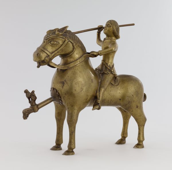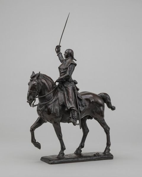 Curator: This bronze sculpture is titled “Indian Warrior,” created by Alexander Phimister Proctor between 1898 and 1918. What are your initial impressions? Editor: The piece feels imposing, doesn't it? There's a certain stoicism in the figure, a sense of power conveyed through the horse's pose and the warrior's upright posture. However, I can't help but wonder about the narrative it's constructing. Curator: That's a key question. Proctor was known for his representations of the American West. The work reflects a prevalent fascination and romanticization of Native American cultures at the time. These images were circulating in popular media, shaping public perception. Editor: And often, distorting it. Was Proctor trying to depict an accurate representation, or was he conforming to and perhaps perpetuating, an existing idealized stereotype? It looks like an overtly masculine, even theatrical portrayal. Curator: His work walks a fine line. Proctor spent time observing and sketching Native Americans, aiming for realism. He also wanted to convey the power of the American West. Contextually, there were very complex power dynamics at play during this era with westward expansion and governmental Indian policies, including forced assimilation. How could this piece possibly avoid getting entangled in that complex socio-political context? Editor: Right, we can’t separate the image from that reality. Who was this warrior in truth, beyond the bronze? What nation, what battles did he fight? Those questions get erased, replaced by a grand, arguably glorified, and sanitized image. Curator: I think it makes us consider how art both reflects and shapes our understanding of history. How this piece ended up in our collection certainly has layers to consider, given that very history. Editor: Absolutely. It’s a visually compelling piece that demands that we look beyond the bronze, to examine the power of representation and the legacy of the American West.