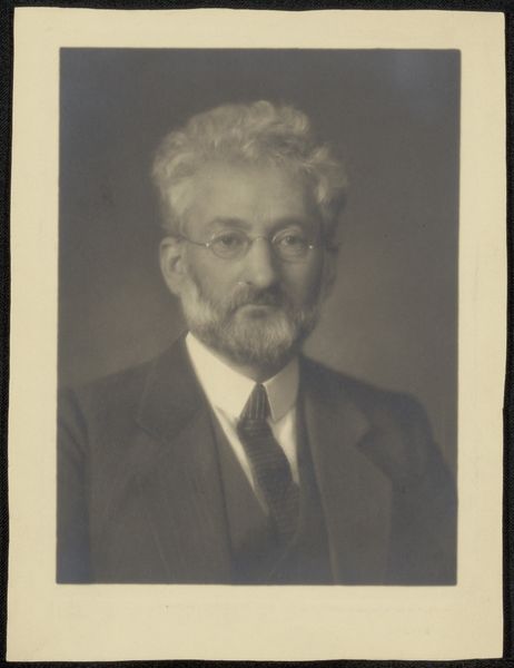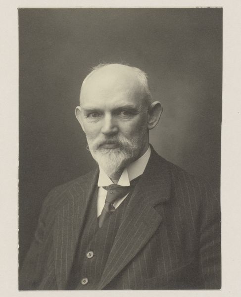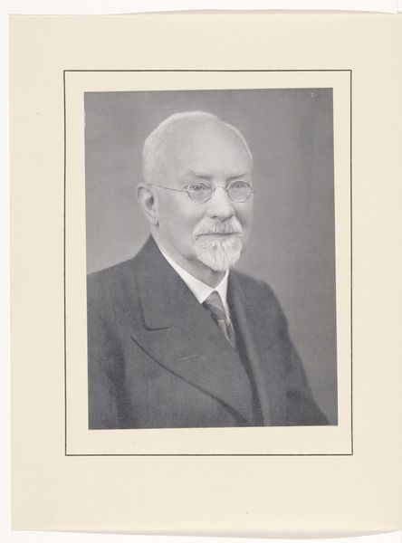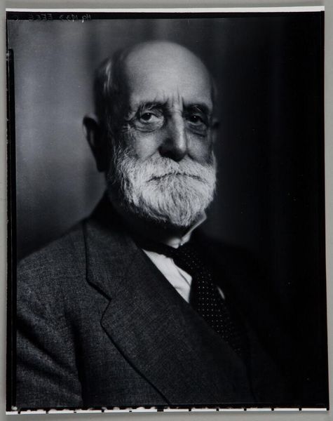 Editor: This is "Portrait of Benjamin Dawson Maggs," a gelatin-silver print dating from after 1935. The subject's distinguished demeanor caught my eye, but the photographic process itself feels very deliberate. What strikes you about this work? Curator: Well, looking at it through a materialist lens, the gelatin-silver print is key. It was a dominant photographic process then, enabling mass production and wider consumption of images. This particular print speaks volumes about the democratization of portraiture at the time. Before, such a formal portrait was reserved for the elite, executed through laborious and costly means like oil painting. Here, photography presents a more accessible and, arguably, reproducible form of identity construction. Editor: So you are saying that the photographic method of gelatin-silver prints had an effect on what was viewed as elite or common? Curator: Exactly! The chemical processes involved—the silver reacting to light, the fixing process to create permanence—highlight the intervention of industrial means. It shifts the focus from individual artistic skill to a standardized procedure. The level of detail, or realism, is itself an outcome of this chemical interaction between subject, light, and the prepared medium. This print encourages one to consider how labor, in both its production and consumption, influences our perception and appreciation of the final image. How does this reproduction of image compare to painting a portrait? What about the labor to mass-produce these photos versus individual ones? Editor: I hadn't considered the shift in labor that this photograph signifies. Thinking about it that way, it truly underscores the societal changes happening with technology in the art world. Curator: Yes, and by thinking critically about production, materiality, and the resulting consumerism, we move past the purely aesthetic reading and into a conversation about the broader social context in which this portrait was made and circulated. I hope you will further consider what art would be without industrial advancements.