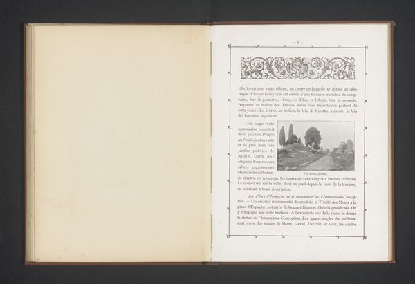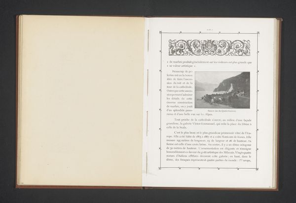 Curator: Ah, here we have a captivating image from around 1870, titled "Gezicht op de San Lorenzo te Genua" by Alfredo Noack. It seems to be a print, perhaps from a book. Look at the facing page and the elegant typography. Editor: Yes, it has a certain old-world charm, doesn't it? The architectural shot of the church is lovely. The entire layout looks a bit like an invitation to travel, although one written in French... I’m drawn to its faded elegance, but what's your first impression? Curator: Faded elegance... a beautiful turn of phrase! For me, it whispers of a bygone era of grand tours and scholarly pursuits, like an early tourist brochure perhaps. Noack clearly had an eye for composition, capturing the monumentality of the San Lorenzo. Notice how the text, rather than just being informative, creates a whole mood. It evokes an age where the handwritten word had weight. How do you think the layout affects your interpretation? Editor: That’s a great point. I see what you mean. It feels very intentional; like a meticulously designed scene. Perhaps the facing page lends authenticity, suggesting an experience captured directly from its time. Do you think that's on purpose or by chance? Curator: Chance? Never! Or perhaps better put: if by chance, a stroke of brilliance! Everything, from the aged paper effect to the somewhat embellished border and typeface, supports the intention, wouldn't you agree? It begs us to dream a little dream, travel far, imagine more, no? Editor: Absolutely, I didn't appreciate how all the little touches support the artist's vision and really elevate the presentation. I will certainly look at this piece differently. Thank you. Curator: The pleasure was mine, entirely. May it inspire you to make your own grand tours, real or imagined!