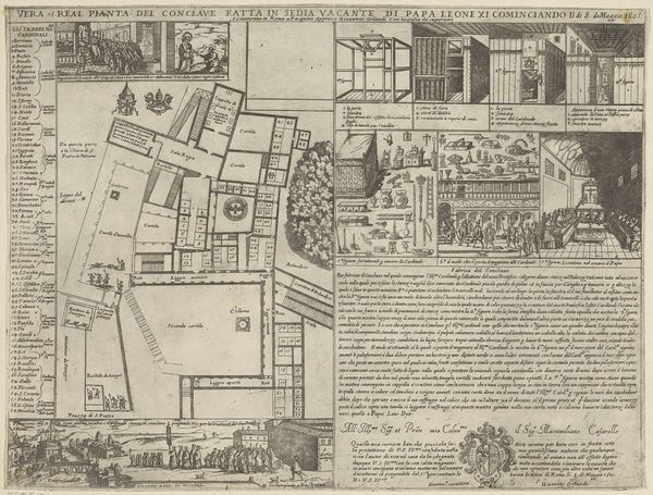 Curator: The work before us, housed at the Rijksmuseum, is entitled "Conclaaf na het overlijden van Innocentius X," created anonymously between 1655 and 1657. It is an engraving, offering a fascinating look at a specific historical event. Editor: It's quite intricate! At first glance, the stark linearity, and the sheer amount of detail give the impression of both precision and a certain...claustrophobia. The various scenes packed around the central architectural plan feel almost suffocating. Curator: Precisely! What strikes me is how the piece illustrates power, not just within the Vatican, but also through the meticulous mapping of space. It presents the Papal Conclave as a political machine, where the urban landscape mirrors hierarchical structures. We can infer the social climate by looking at this representation of space as an instrument of control. Editor: I’m more interested in the way it balances symbolic representation with structural detail. Note how the architectural plan anchors the composition, its sharp lines counterpointed by the more fluid narratives in the surrounding vignettes. This gives it a sense of order, like a blueprint not just of a building, but of an event, with clearly defined movements. Curator: Consider the images placed around the plan; they narrate rituals and processes involved in electing a new Pope after Innocentius X died. This illustrates a power transition occurring publicly, yet confined behind Vatican walls. It raises questions about the role of public image-making, specifically what aspects the Church chose to emphasize during times of leadership changes. Editor: I see that. What I'm finding engaging, however, is the dramatic play between the micro and macro. The print overall appears documentary; yet it leads the viewer’s eye intentionally from wider schematics right down to intensely intimate procedures inside those guarded chambers. That modulation itself expresses something crucial. Curator: Definitely. This "plan" also becomes a means to broadcast the legitimacy and unbroken legacy of the Papacy to audiences near and far. With an engraving such as this, reproduced repeatedly, it provided symbolic reinforcement that tradition persevered. Editor: Yes. Now seeing the engraving more completely as a totality…there’s a remarkable sense of designed integration, where no single pictorial method exists separate from some larger expressive, ideational unity of parts. Curator: Thank you, those insights have definitely heightened my appreciation for the design choices implicit to broadcasting the operations of this time. Editor: Likewise, thank you for helping me place such considerations into history.
