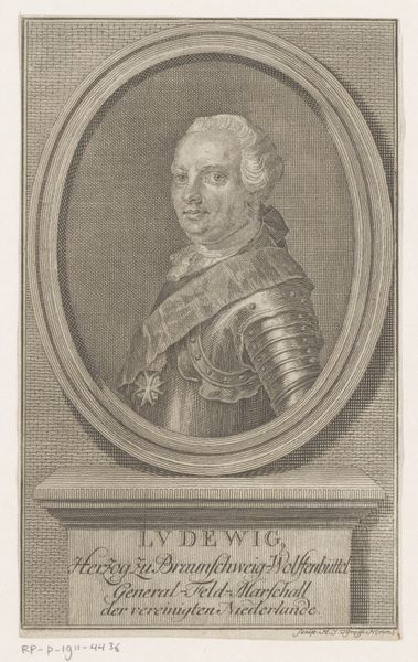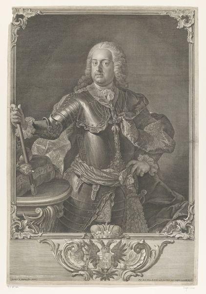 Editor: Here we have Gottfried von Steinberg’s "Portret van Maximiliaan III Jozef, keurvorst van Beieren," an engraving, placing its creation somewhere between 1745 and 1782. The detail is quite remarkable, especially given the medium. What strikes me is how this formal portrait also seems to subtly hint at the weight of leadership. What do you make of it? Curator: This portrait exemplifies the role of art in legitimizing power during the Baroque era. The print served a crucial public function, disseminating the image and authority of Maximilian III Joseph throughout Bavaria and beyond. Consider the inclusion of the Electoral coat of arms – it's not merely decorative, it's a potent symbol of lineage and the divinely sanctioned right to rule. How does that framing affect our understanding of Maximilian Joseph, do you think? Editor: It makes him seem almost untouchable, set apart from everyday life. The oval frame feels like a window into a different, more elevated reality. Does the choice of engraving, as opposed to painting, have any bearing on that? Curator: Absolutely. Engravings allowed for mass production and widespread circulation. Unlike an oil painting seen only by a select few, this print democratized access to the ruler's image. This accessibility helped reinforce his position within the collective consciousness. Think about the messages this portrait conveys about Bavarian identity and Maximilian’s role in shaping that. Editor: It's interesting how the same image can serve both to elevate and to distribute power. The detail encourages close study but the medium allows for a very wide reach. Thanks for helping me think about that dynamic. Curator: It highlights the fascinating paradox inherent in art commissioned by the elite. By understanding the socio-political context of its creation and dissemination, we get a much richer appreciation.