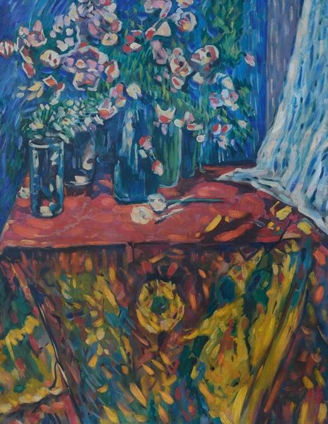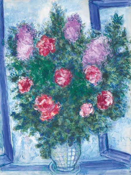 Marc Chagall made this painting of a flowering tree and a green house against a blue background using oil on canvas. The first thing I notice are the colours, they're so joyful! The paint is applied pretty thickly, you can almost feel the texture of the canvas underneath. It’s like he’s building up the image with these bold, confident strokes. Look closely at the way he's painted the flowers. They’re not delicate or precise, but there’s an energy and freedom in the way he’s captured their essence. It's like the painting is a conversation between different parts of himself, a sort of dreamlike vision. When I see this, I think of other artists like Matisse, who also used colour and bold shapes to express a sense of joy and vitality.