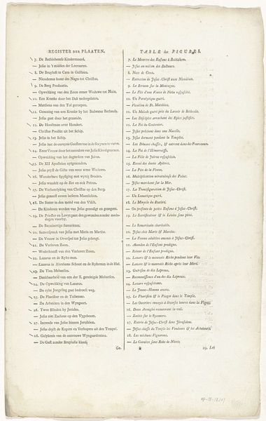 This is "Register van afbeeldingen uit het Oude Testament," made by Johannes de Groot II in the late 17th or early 18th century. It is an example of a print on paper, presenting a table of figures from the Old Testament. The bilateral symmetry splits the table into two columns of Dutch and French. The composition uses contrasting fonts to signal different textual functions, such as headings and descriptions. A semiotic analysis reveals the ordering of text and language reflecting specific cultural and intellectual codes of the time. The rigid grid-like arrangement speaks to an era concerned with systematization. Despite its seemingly straightforward presentation, the register's structure destabilizes any singular reading. It invites comparative analysis across languages, questioning fixed meanings. The piece functions as a matrix of potential interpretations, emphasizing the fluidity inherent in textual representation and cross-linguistic exchange. This reflects a broader philosophical engagement with how language shapes and mediates understanding.