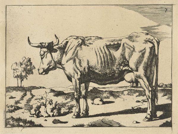 Editor: Here we have "Twee koeien," or "Two Cows," by Aelbert Cuyp, created sometime between 1630 and 1691. It’s a print – an etching, to be precise – and what strikes me immediately is how simple the composition is, almost stark. What do you see in this piece, focusing on its formal elements? Curator: Indeed. Let us examine the visual relationships established within this work. Observe the interplay between the mass of the dominant cow and the delicate lines that define its form. Consider how the etching technique itself, the strategic use of light and shadow achieved through varied line weight and density, contributes to a sense of volume and texture. The sparse landscape serves primarily to ground the figure, drawing attention to its inherent structure. Does the subject matter alone define the aesthetic impact, or is there something more at play with the arrangement of shape and form? Editor: I see what you mean. The etching lines really do give the cow a tangible weight, especially in contrast to the sketchier background. And that negative space above the cow, it almost amplifies its presence, doesn't it? It becomes more about the shapes and less about just...cows. Curator: Precisely. By focusing on the inherent visual properties - line, tone, composition - one begins to decode how meaning and artistic expression reside within the structural elements themselves, and that informs, or even transcends, mere representational content. This focus then invites questions such as, “How does Cuyp’s technique influence your emotional response to the animal form?” Editor: I hadn't thought of it that way. Analyzing the technique does make the whole piece feel much more intentional, less like a simple pastoral scene and more of an artistic statement about form and light. Thanks! Curator: A pleasure. It is through such focused observations that we enrich our aesthetic vocabulary.