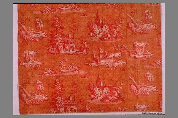 Jean-Baptiste Huet I created "Les Offrands à l'Amour", a textile now housed in the Metropolitan Museum of Art. The immediate visual impression is one of intricate patterning, with red figures and motifs densely arranged against a light background. The composition lacks a central focus, inviting the eye to wander across a landscape filled with pastoral scenes and allegorical references. Huet employs a limited palette, emphasizing form and line. The repetition of figures creates a rhythm, reminiscent of classical friezes, yet the sprawling composition rejects a clear narrative hierarchy. This challenges the viewer to piece together meaning from the array of images. The stylized depictions, with figures offering tributes to love amidst idyllic settings, could reflect the era's preoccupation with pastoral themes, while also exploring deeper ideas about desire, ritual, and the idealized natural world. Note how Huet uses the textile medium to challenge traditional notions of pictorial space. The design blurs the lines between art and craft, inviting us to reconsider the cultural codes embedded in decorative arts. The artwork doesn't offer a singular message; instead, it's a site where meanings are produced and renegotiated.